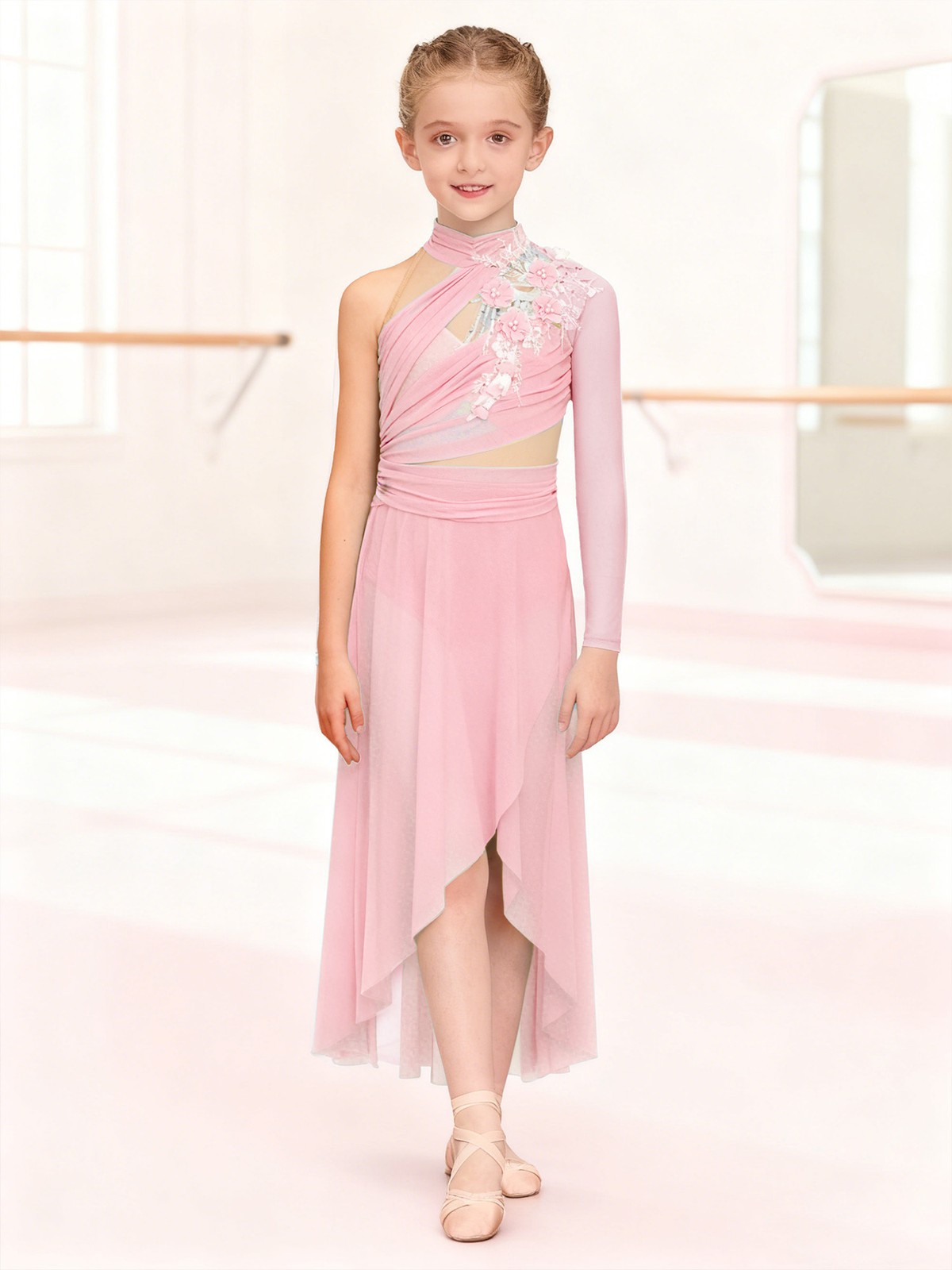 US Kids Dance Dress Applique Ruched Leotard Contemporary High Low Mesh Skirt