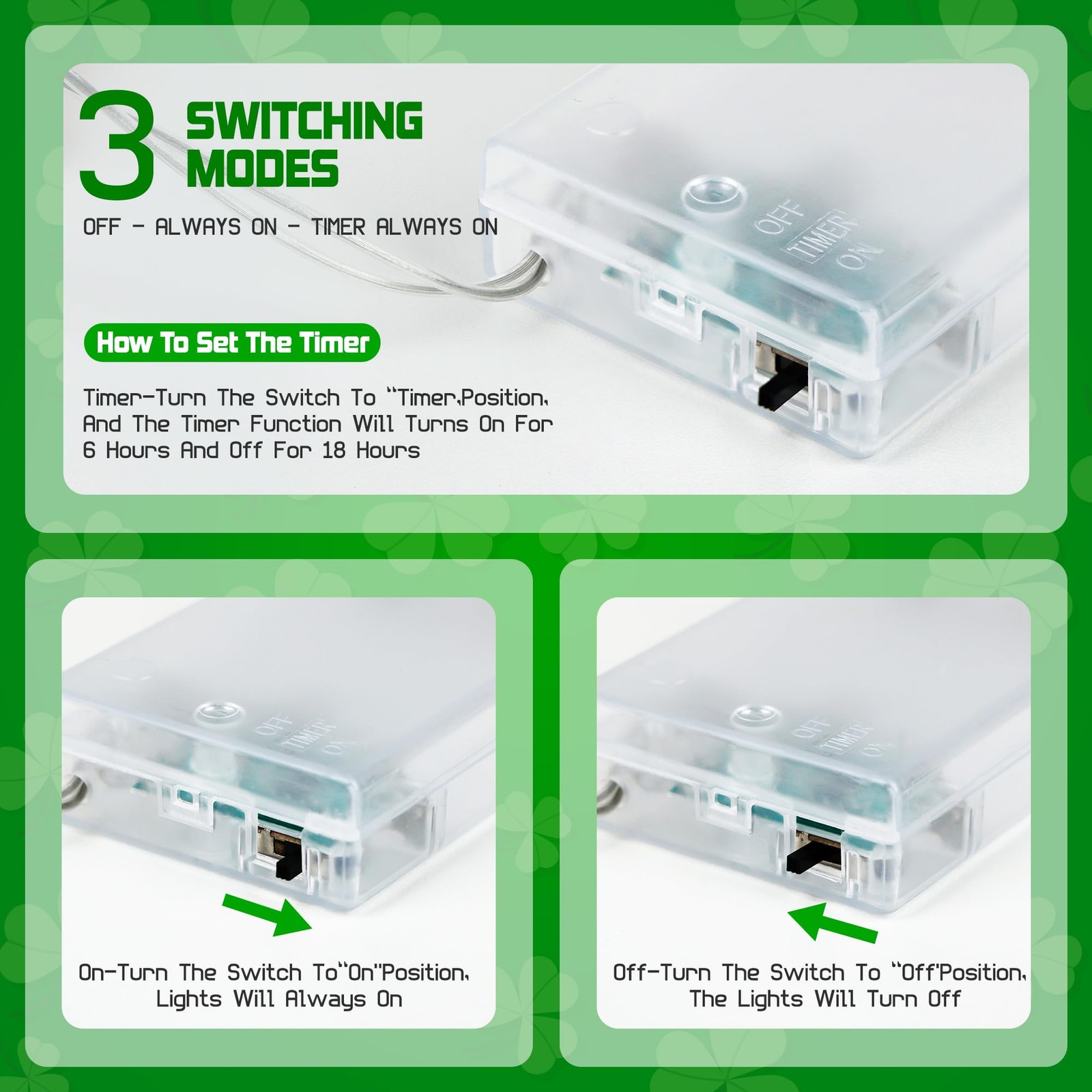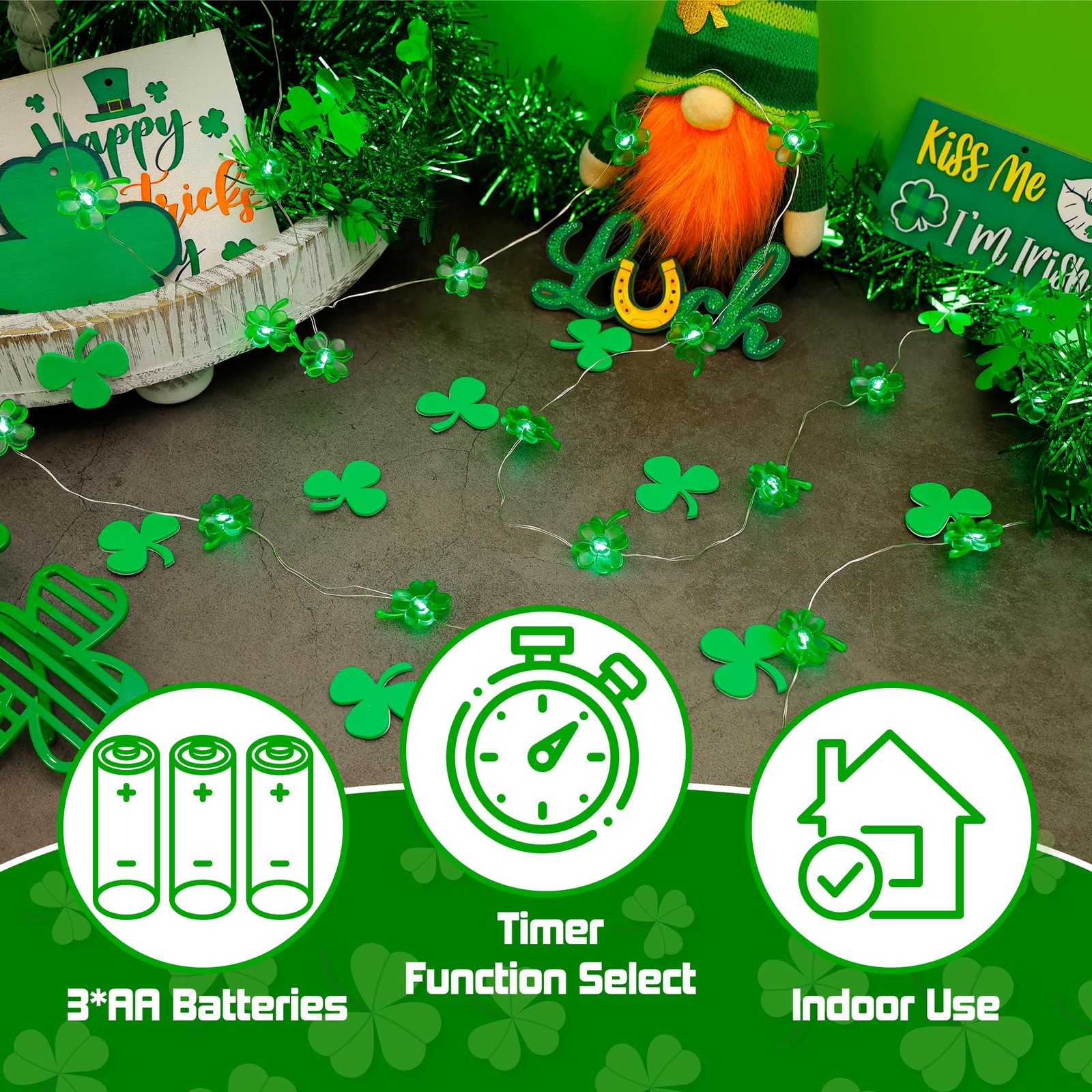 St Patricks Day Shamrock Lights - 30 LED 10Ft Green Lucky 11.5 feet,