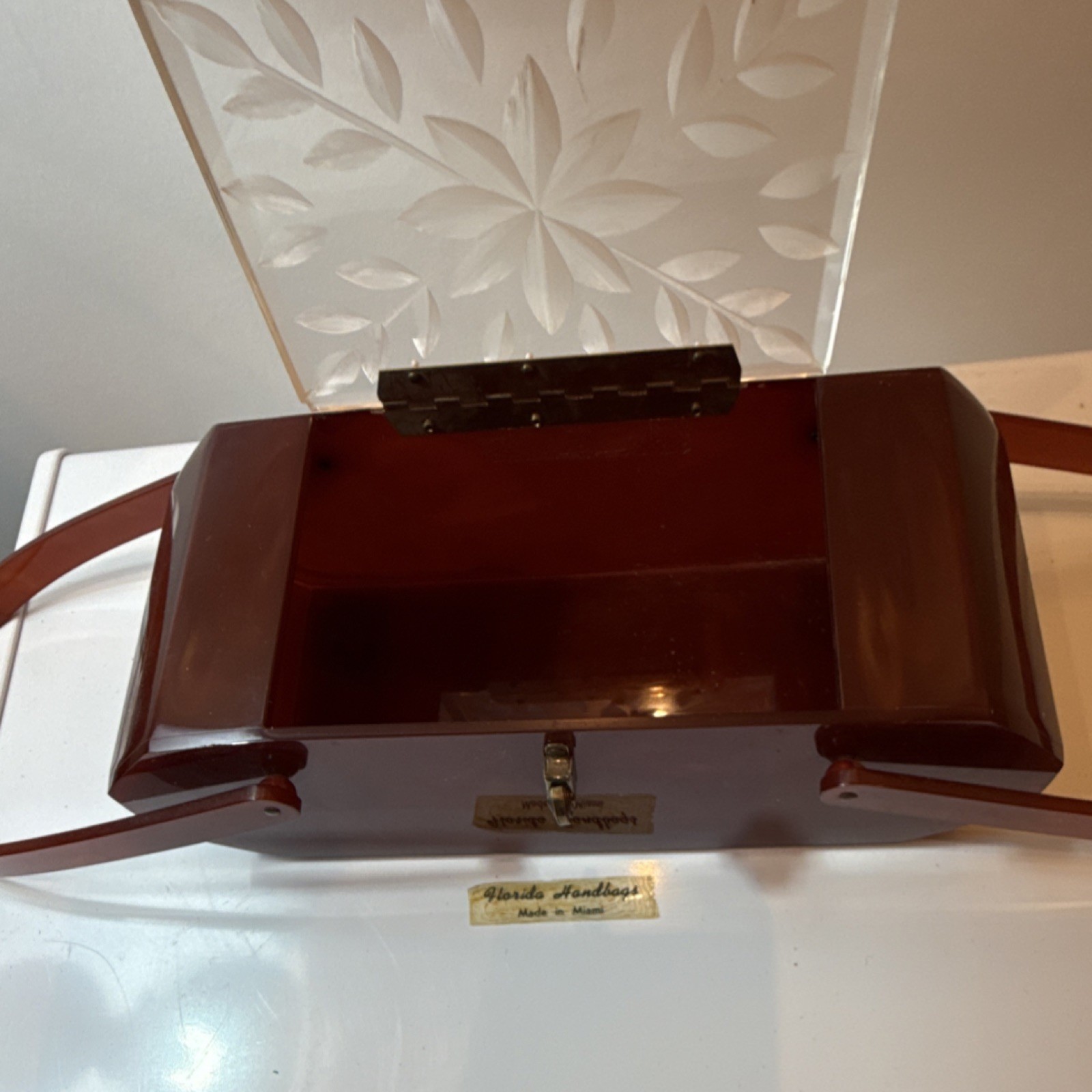 Florida Handbags Lucite Box Purse Brown Clear Etched Lid Floral Design