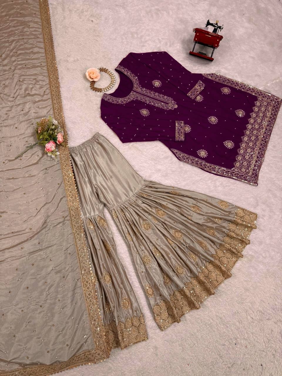 Exclusive Look Chinon Silk Purple Top Palazzo With Dupatta For Function Wear