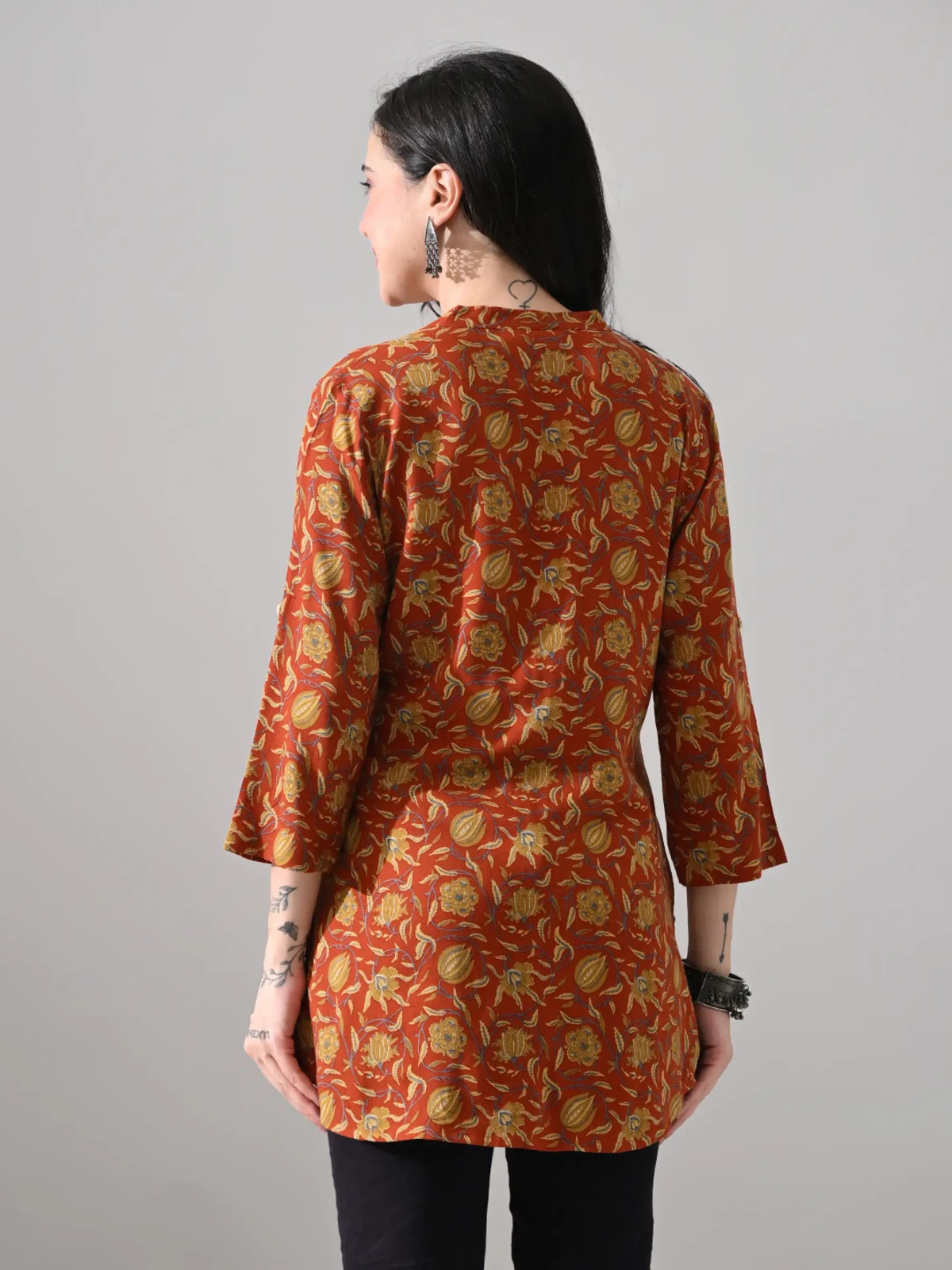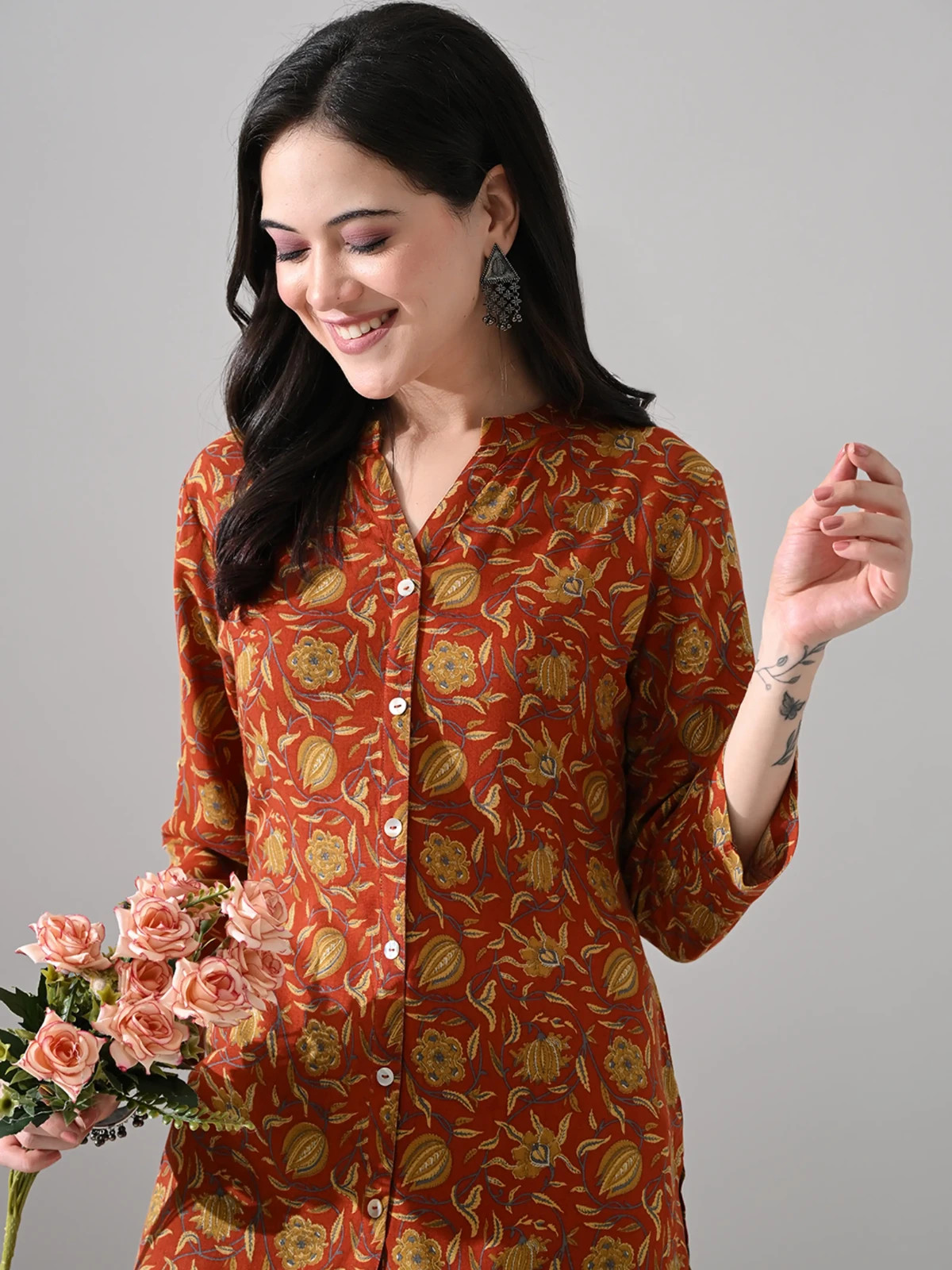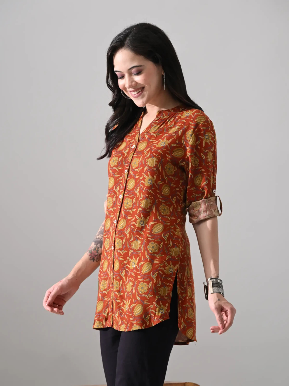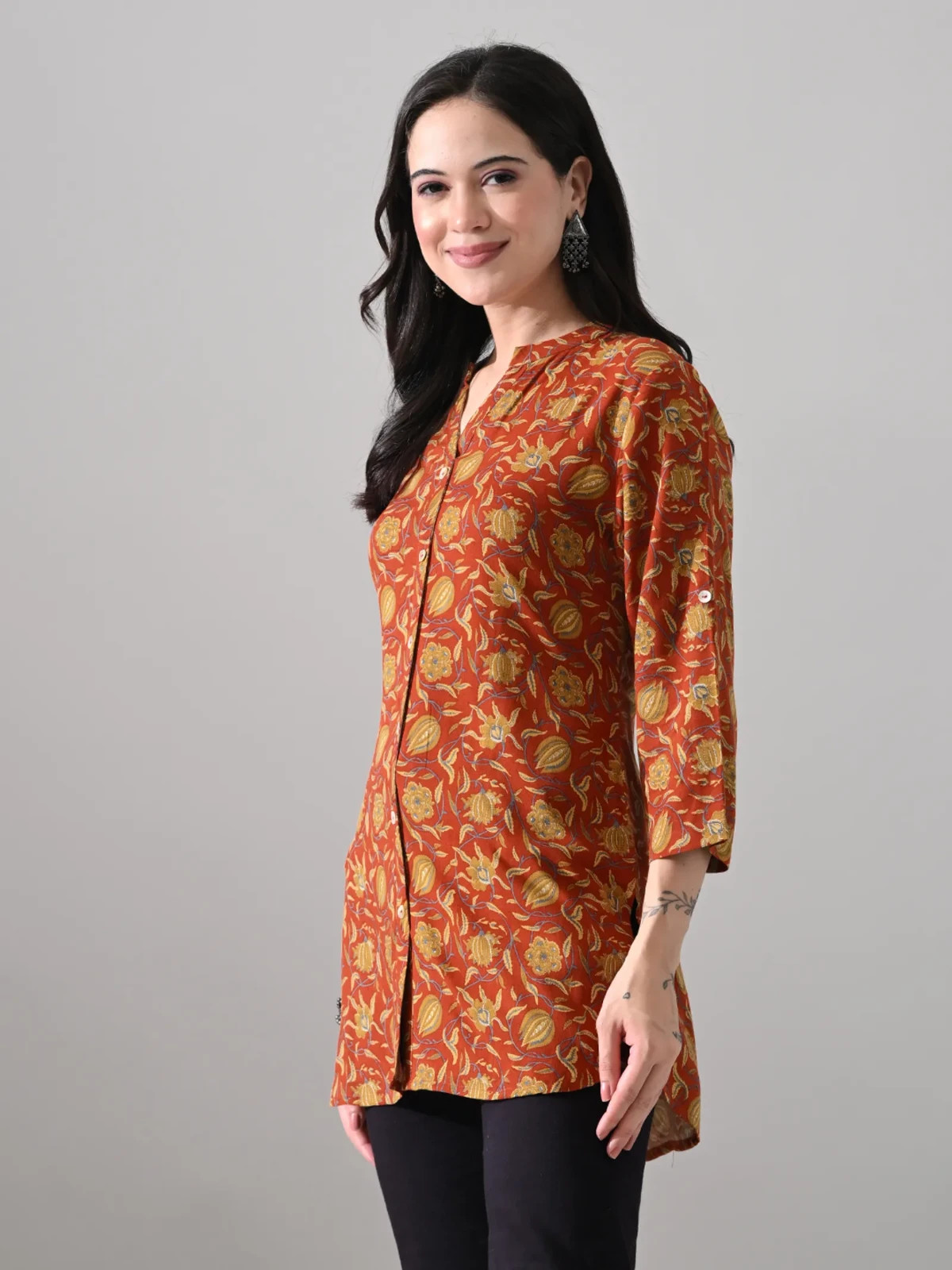 Indian Women Brown Rayon Floral Printed Kurta Kurti Top Tunic New Dress