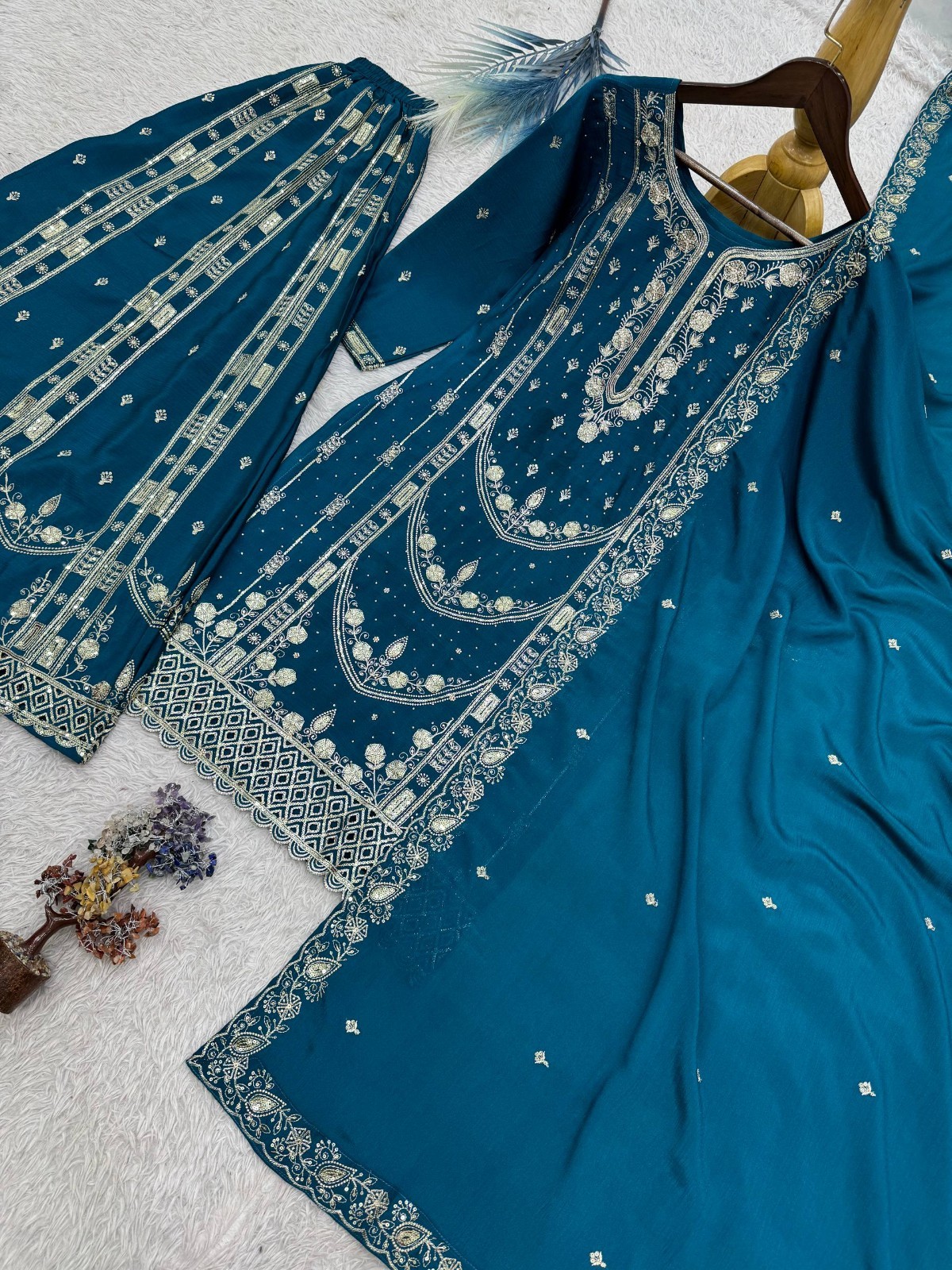 Stunning Pure Jarman Chinon Silk Blue Top Palazzo With Dupatta For Ethnic Wear