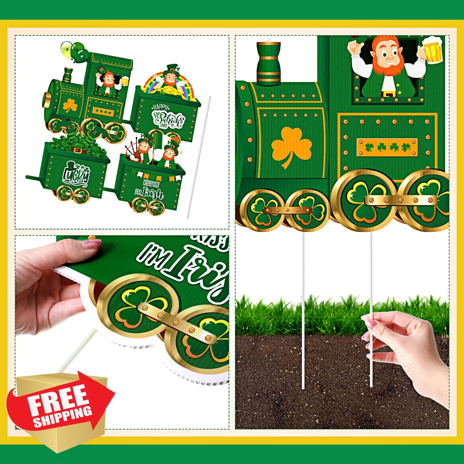 4 St. Patrick's Day Yard Signs Decor Train Leprechaun Stakes