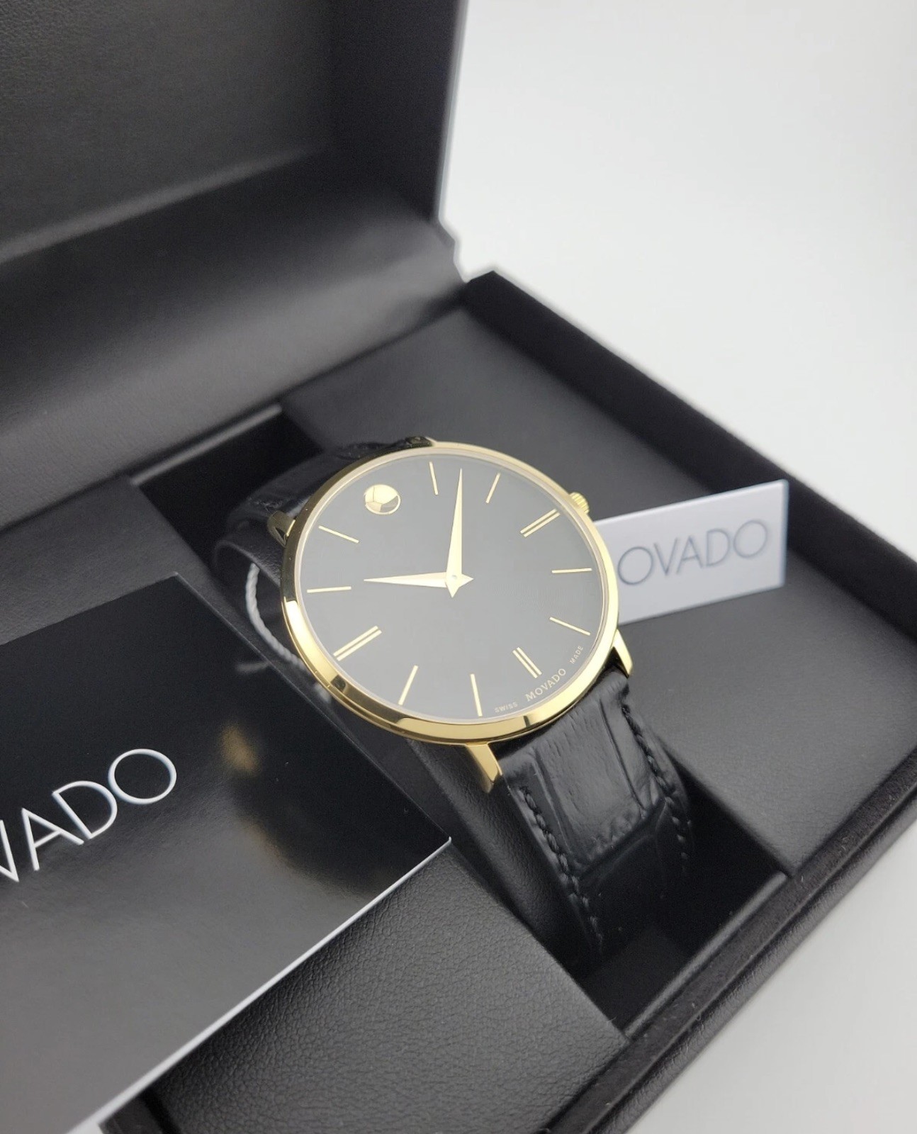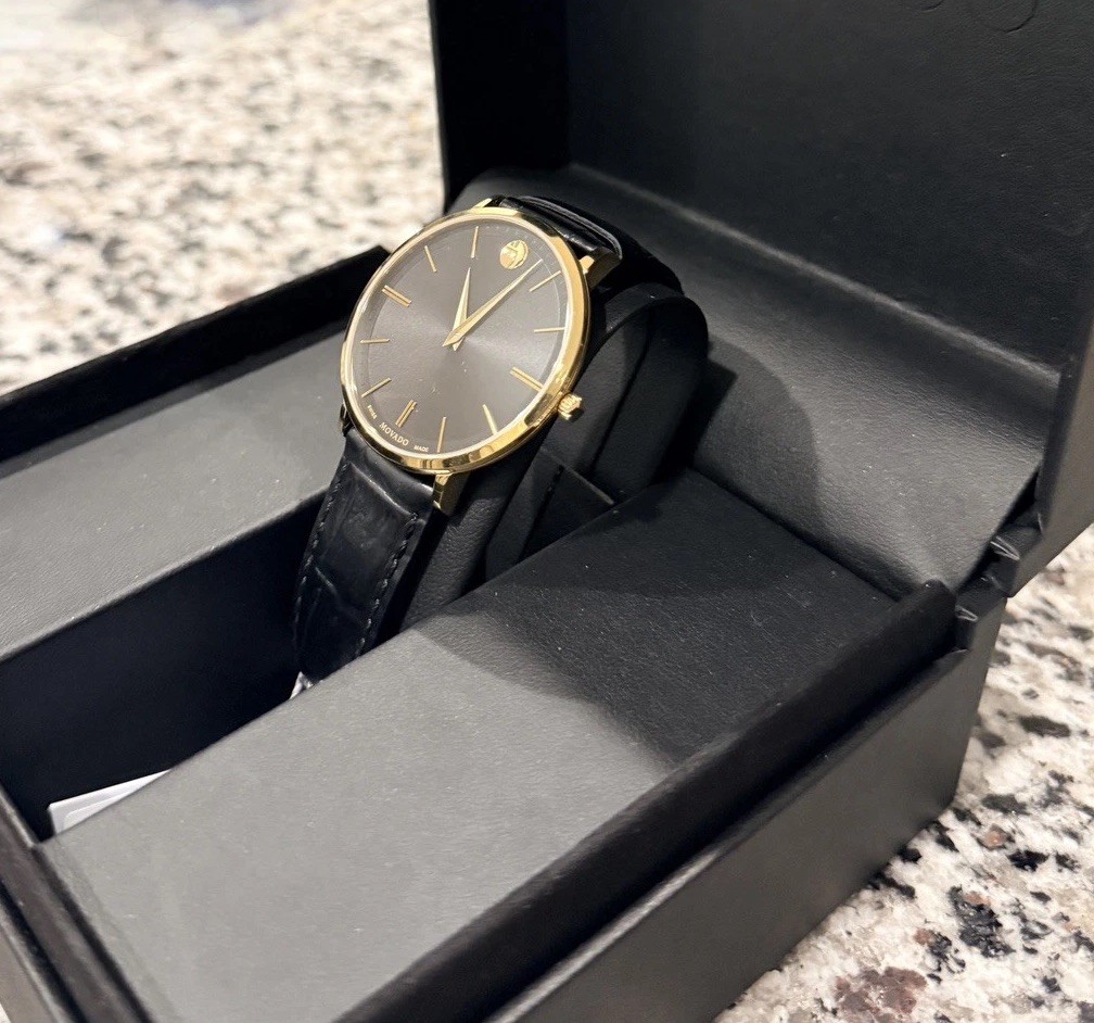 как выглядит 795 MSRP Movado Mens Ultra Slim Black Dial Leather Band Watch - 0607173 фото