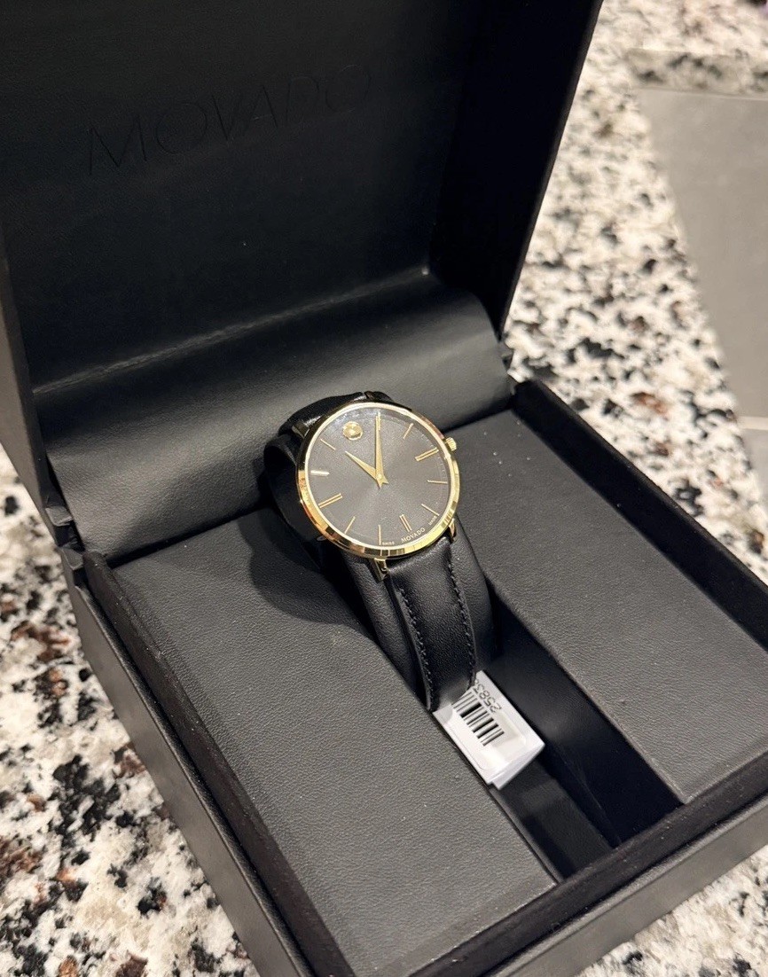 795 MSRP Movado Men's Ultra Slim Black Dial Leather Band Watch - 0607173