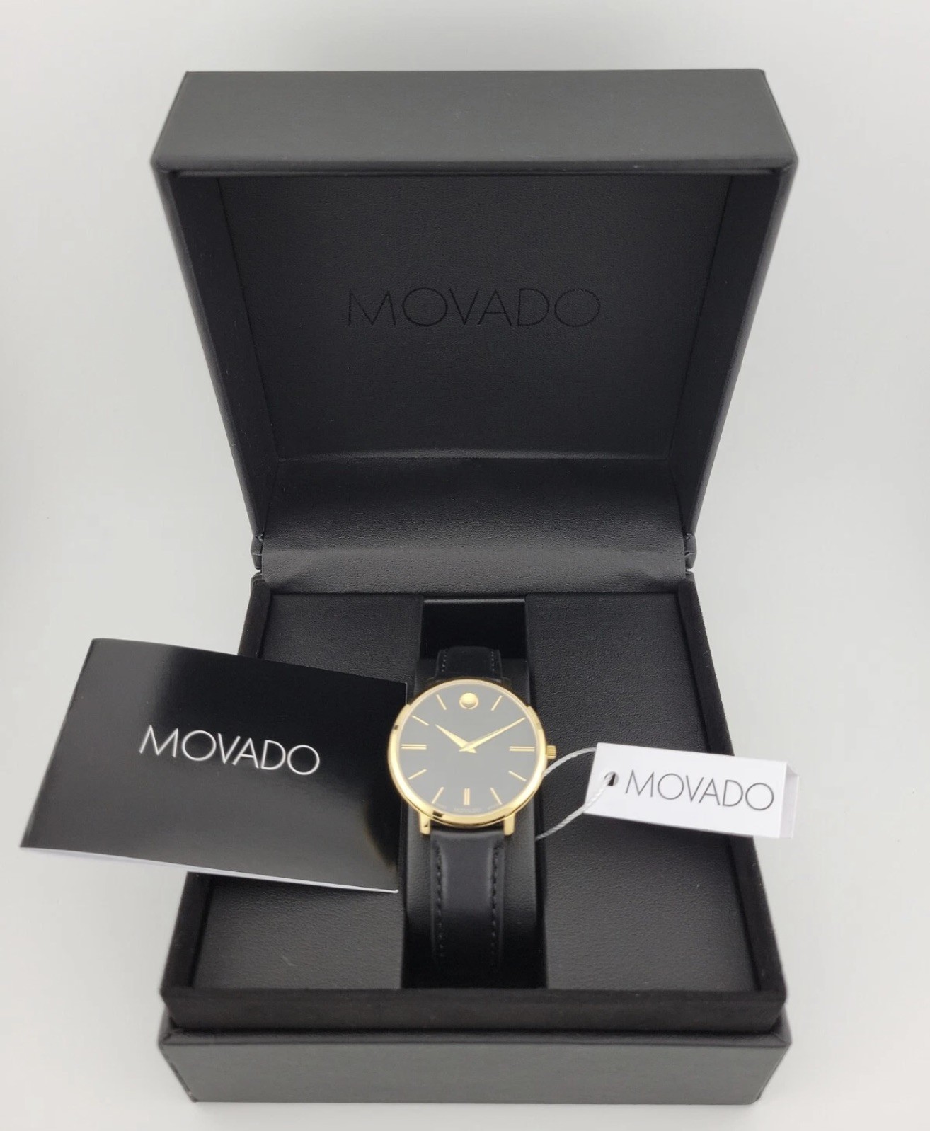 795 MSRP Movado Women's Ultra Slim Black Dial Leather Strap Watch 0607091 NEW