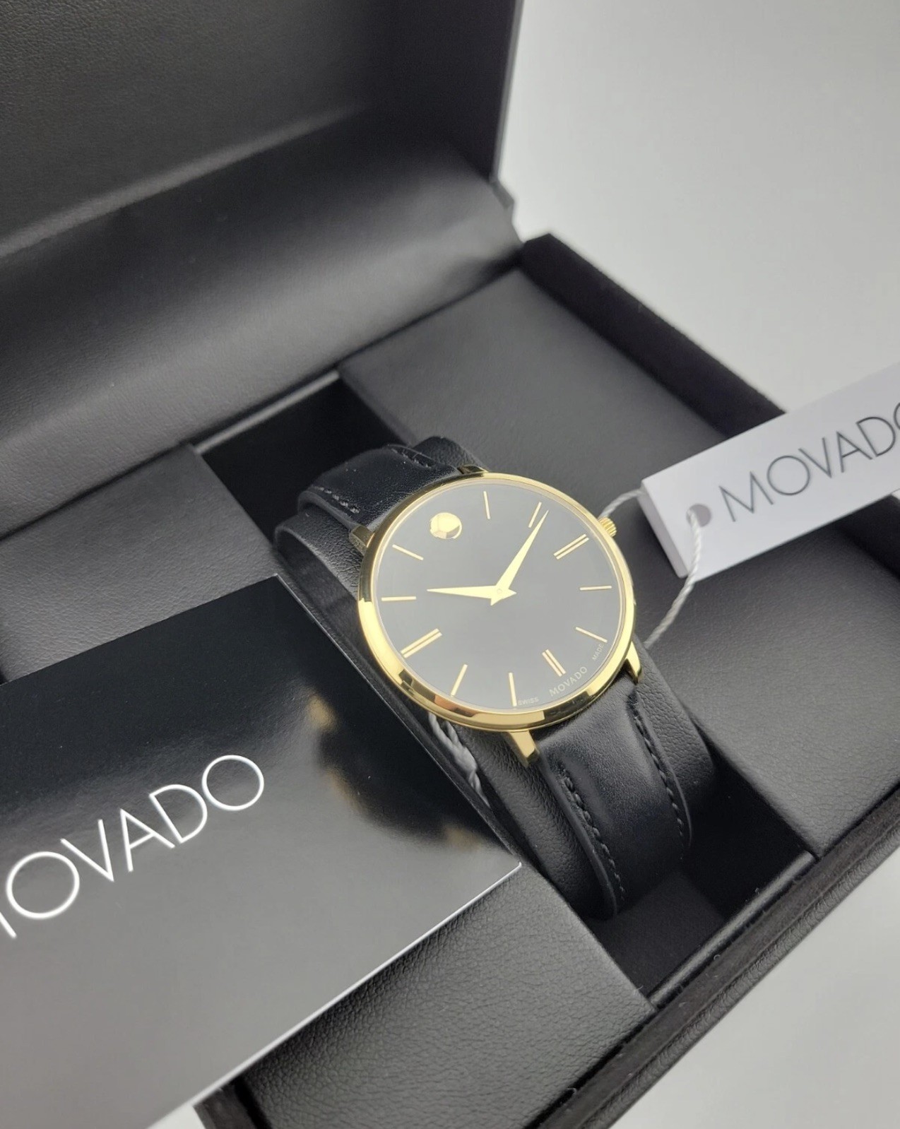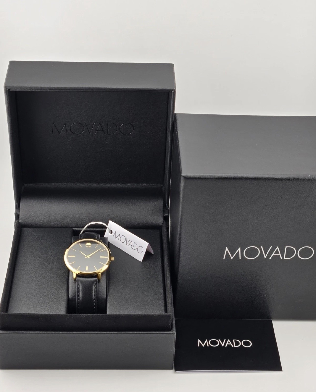 как выглядит 795 MSRP Movado Womens Ultra Slim Black Dial Leather Strap Watch 0607091 NEW фото