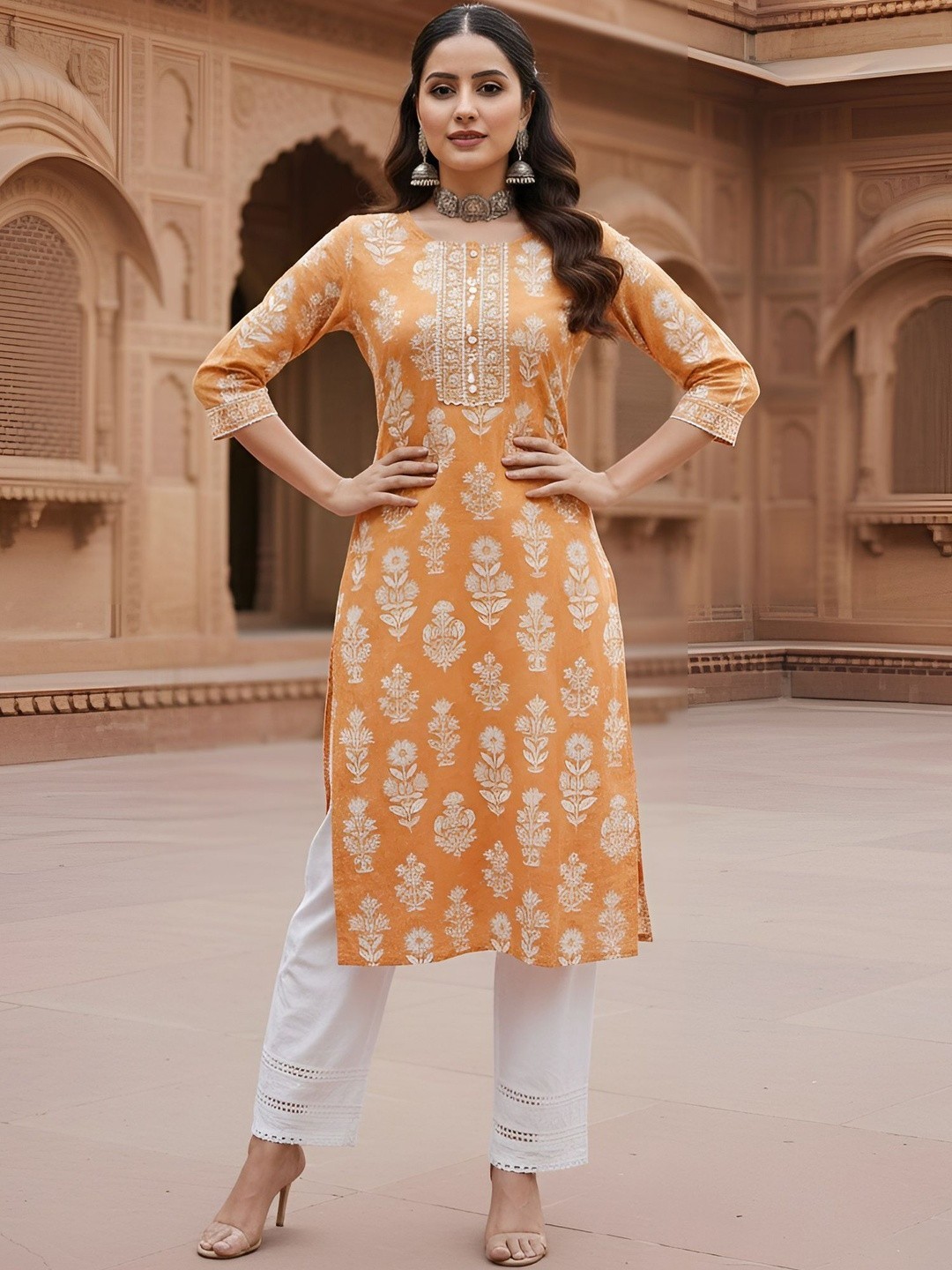 как выглядит Indian Women BEAUTIFUL Orange Cotton Ethnic Motifs Printed Kurta Kurti Top Tunic фото