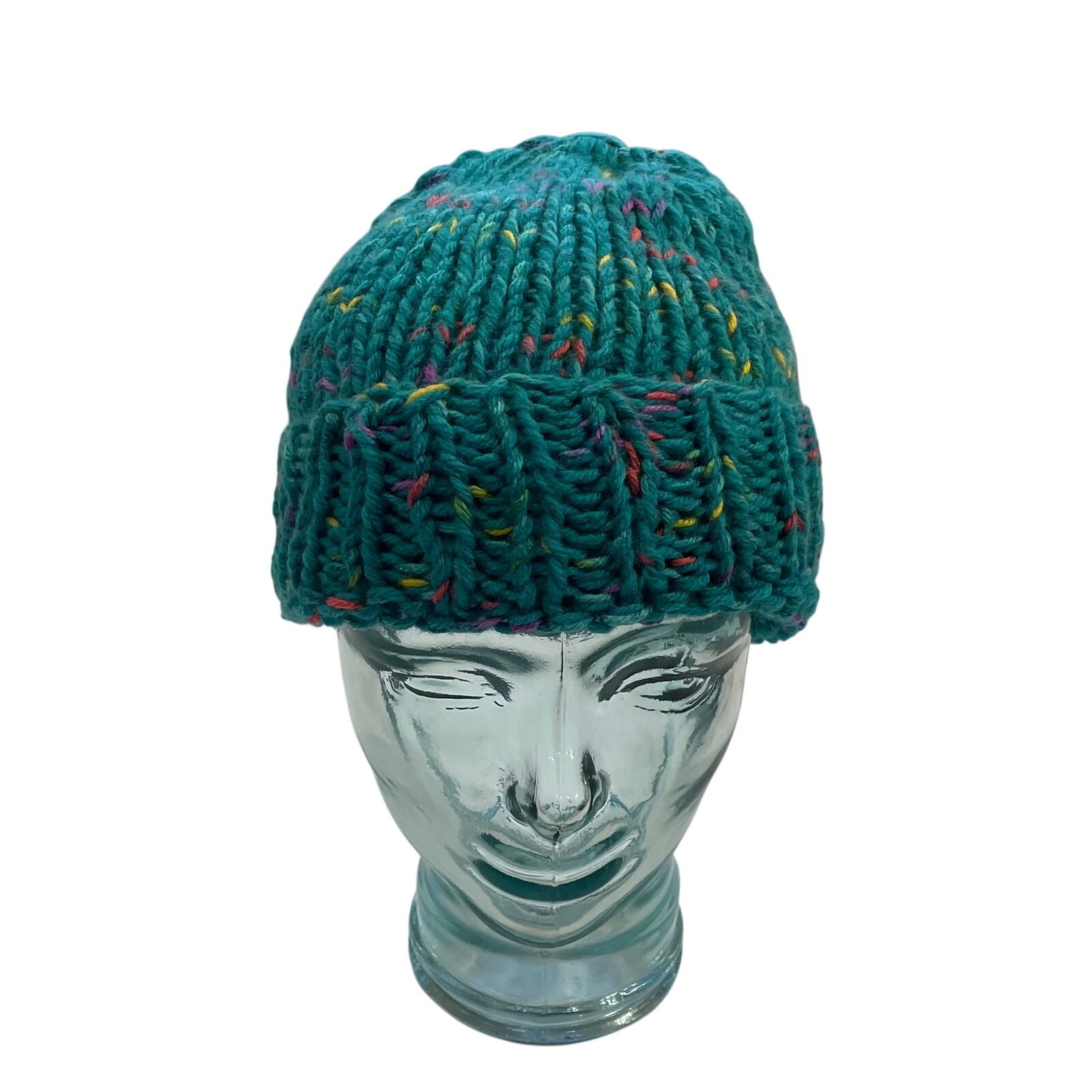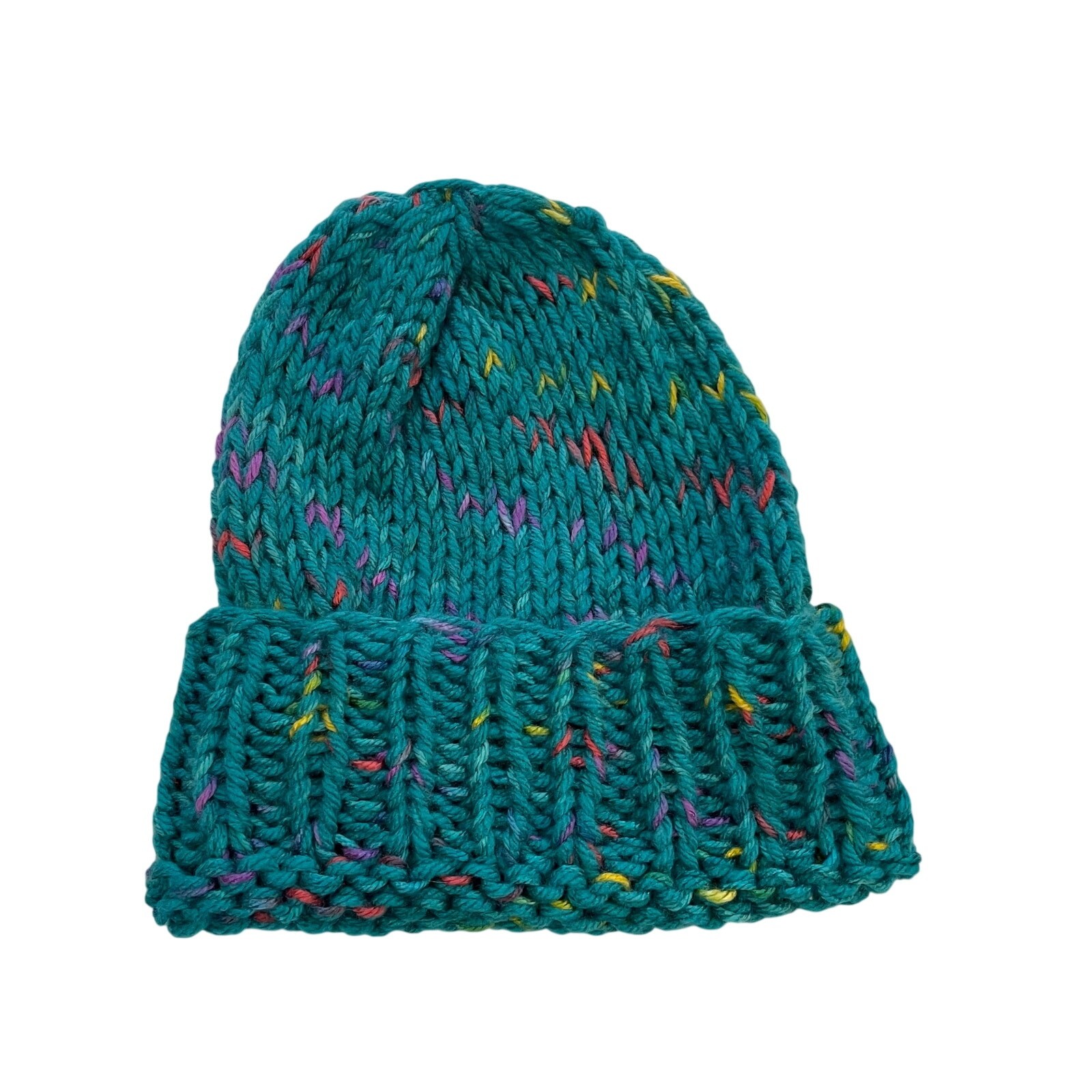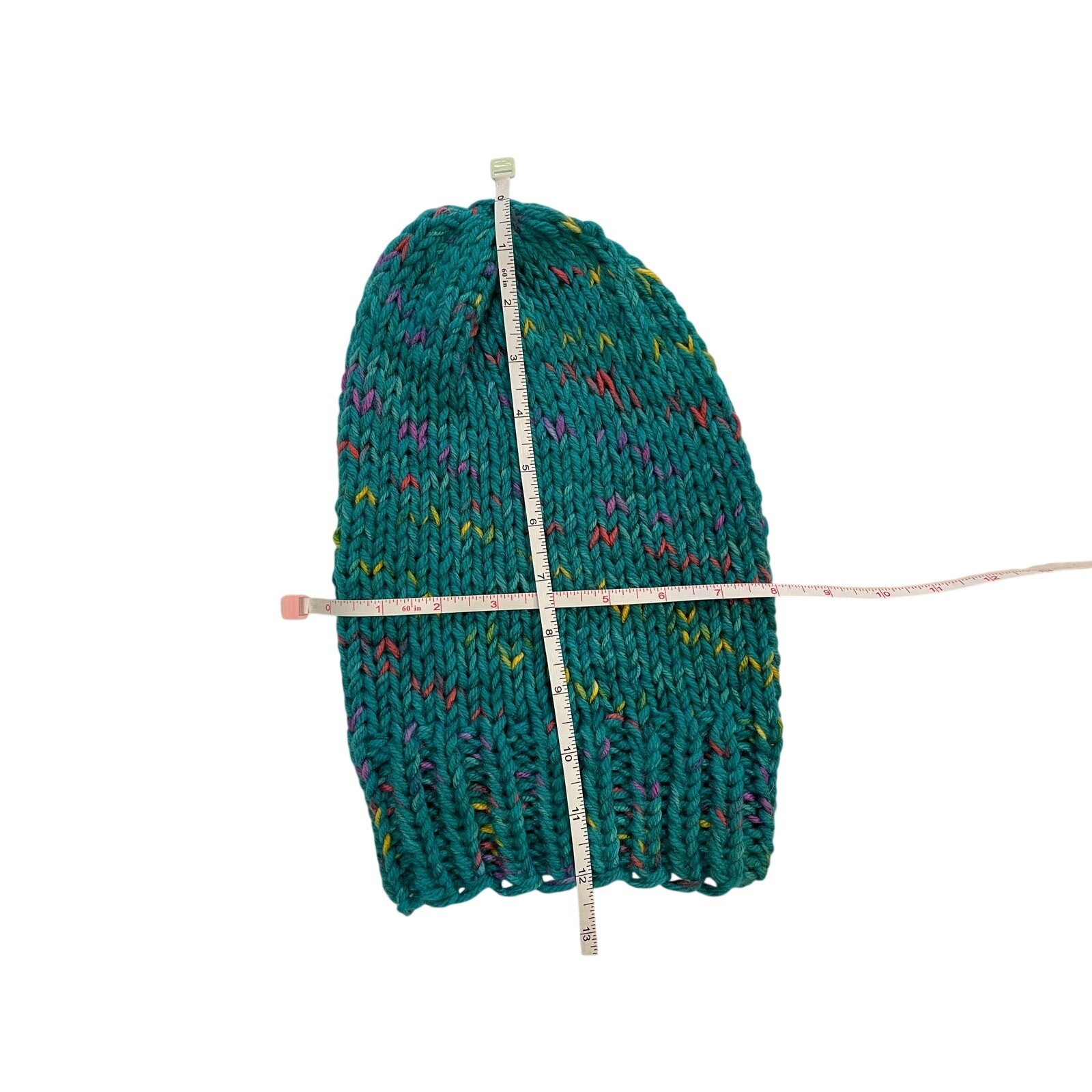 Teal Blue Multicolor Hand Knit Chunky Knit Cuffed Beanie / Hat, OS