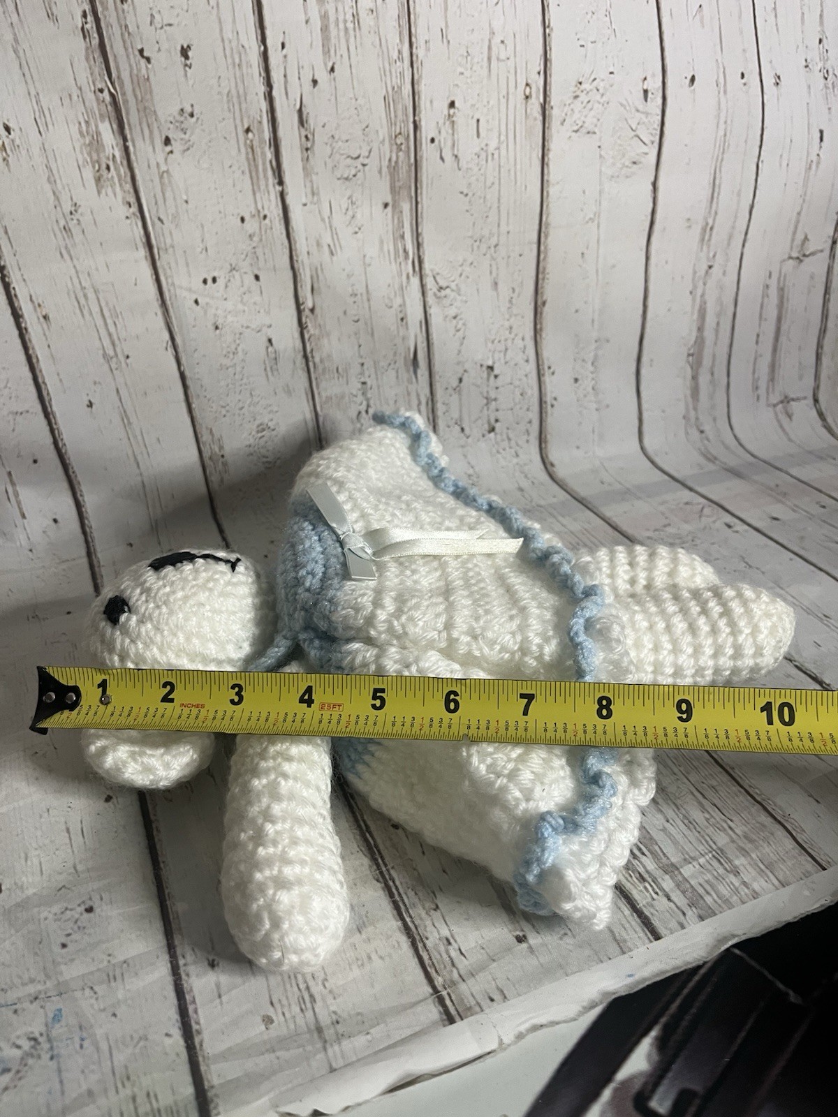как выглядит Handmade Crochet White Teddy Bear Stuffed Animal Doll In Blue Dress фото