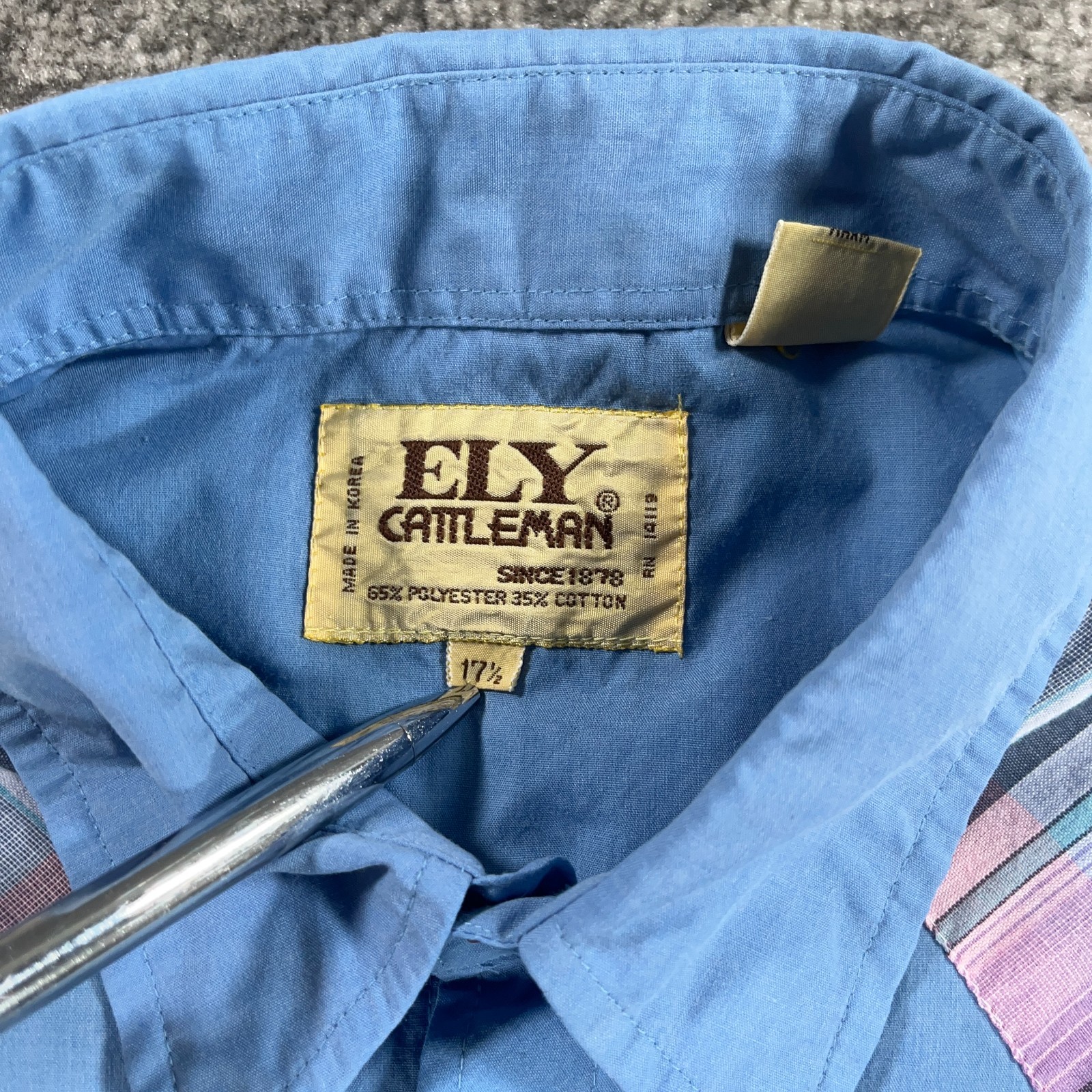 Vintage Ely Cattleman Western Shirt Mens XL Blue Pink Plaid Yoke Pearl Snap 80s