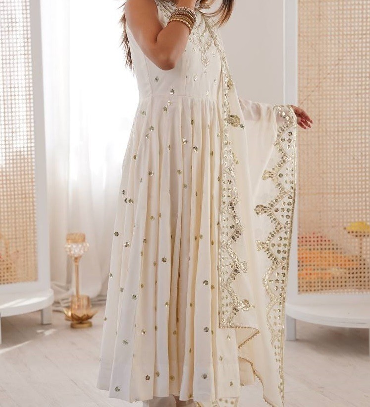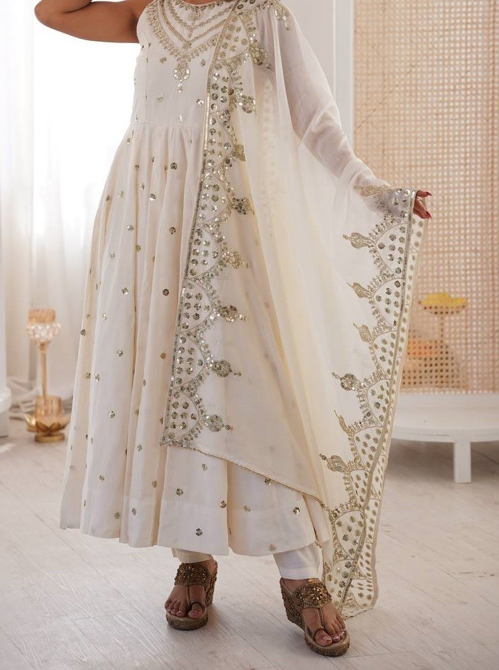 как выглядит New Launching Roman Silk White Gown Bottom With Dupatta For Women Party Wear фото