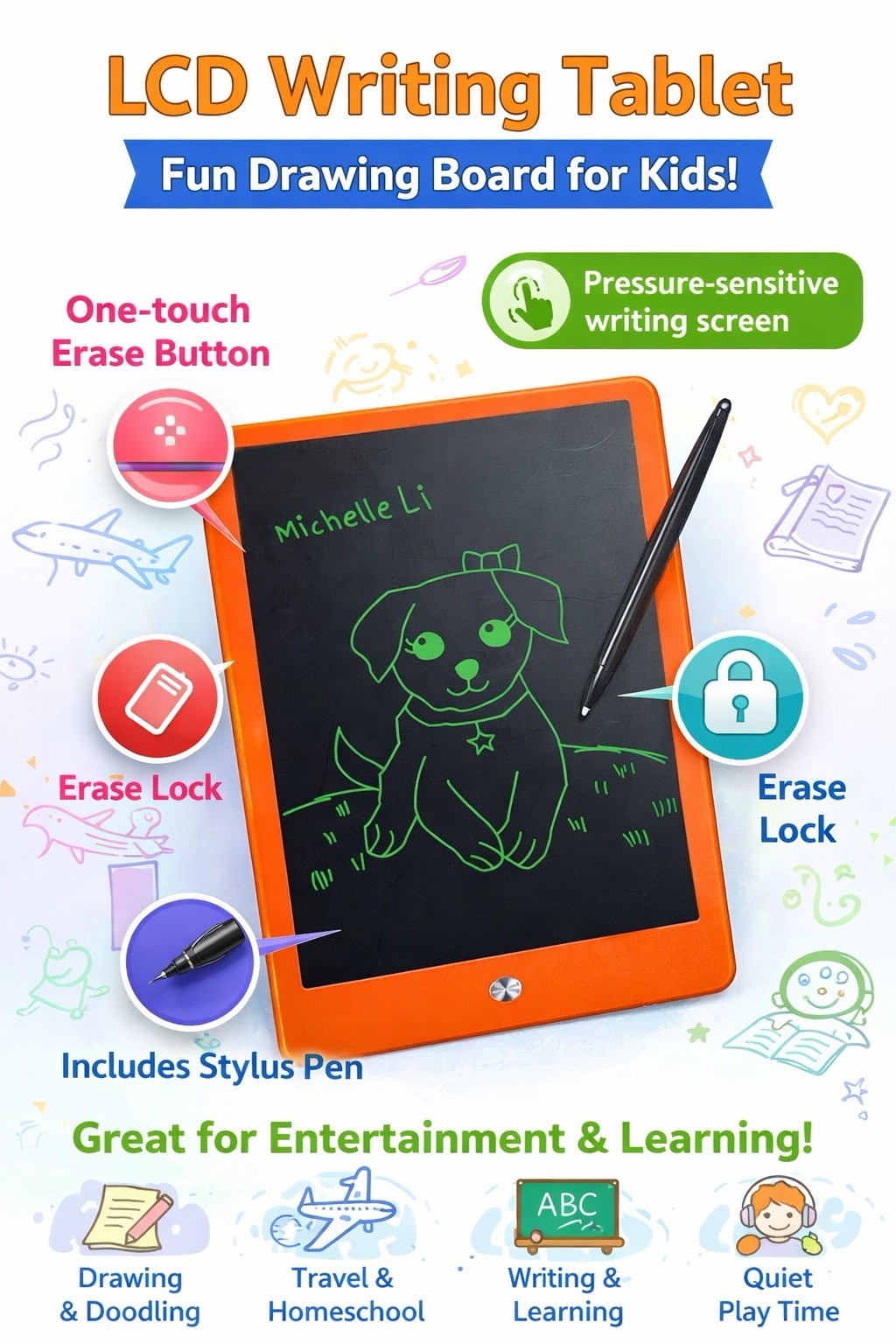 LCD Writing Tablet Kids Drawing Board Reusable Doodle Pad w/ Stylus Erase. PINK