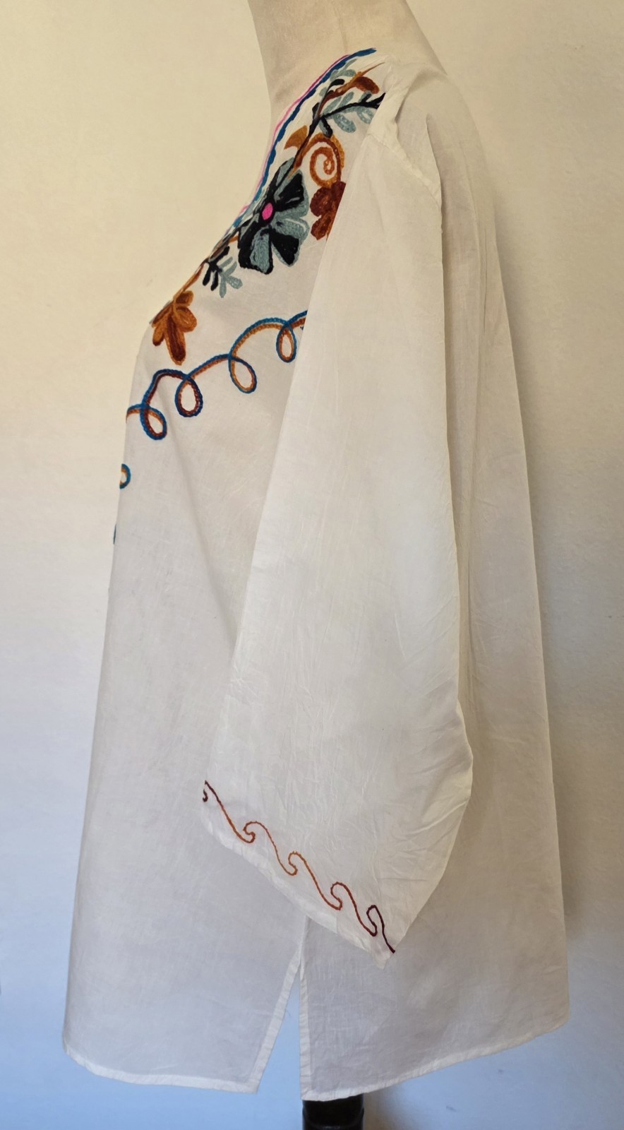 Cotton Tunic 3/4 Slevees XXL Beige Summer Ethnic Flowers Embroidery Bohemian