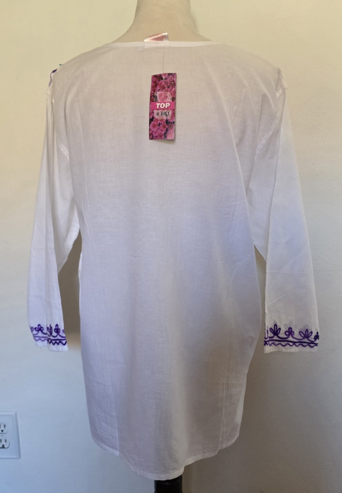 Cotton Tunic 3/4 Slevees XXL White Summer Ethnic Flowers Embroidery Bohemian