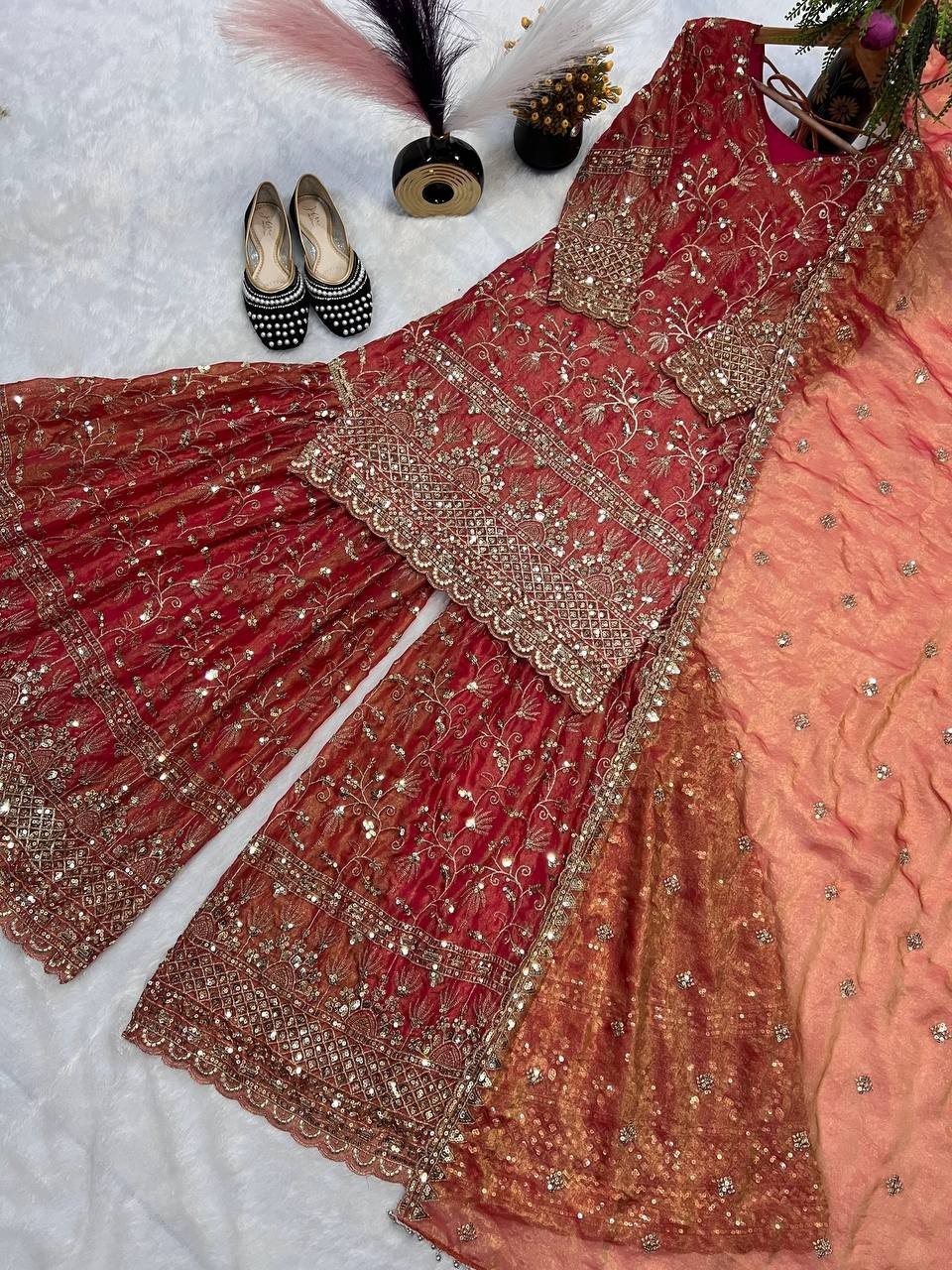 Exclusive Designer Crushi Silk Top Palazzo And Dupatta For Reception