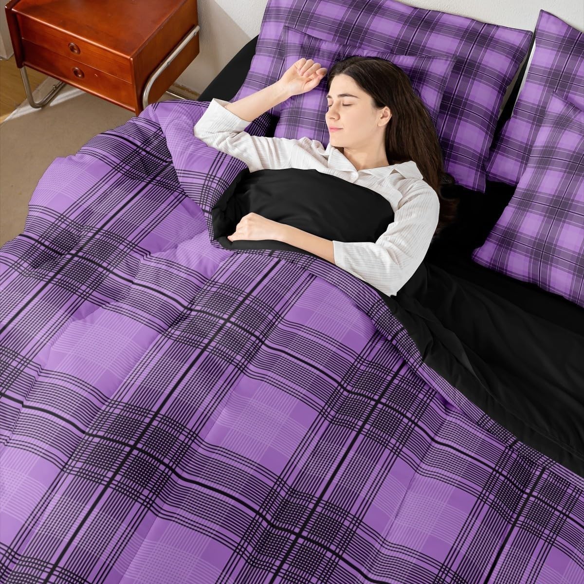 Purple Black Plaid Comforter Set Queen Size 7 Pieces Checkered Geometric Bedding