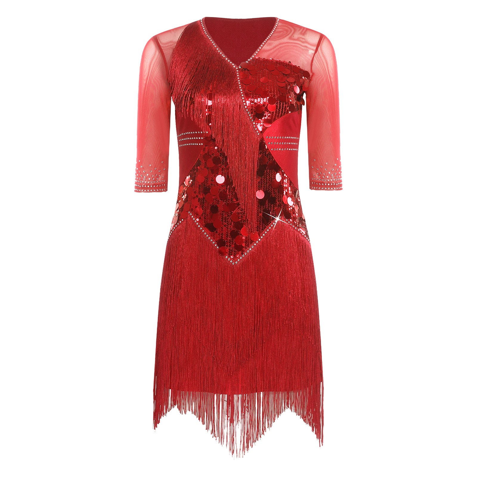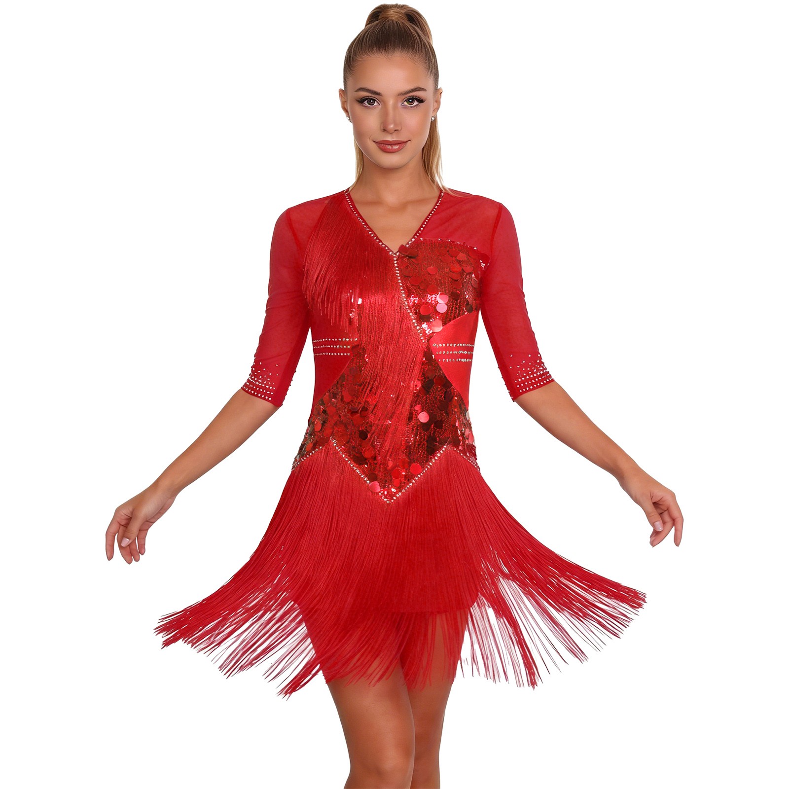 Women's Sequin Latin Dance Dress V Neck Fringe Salsa Tango Dresses Asymmetrical