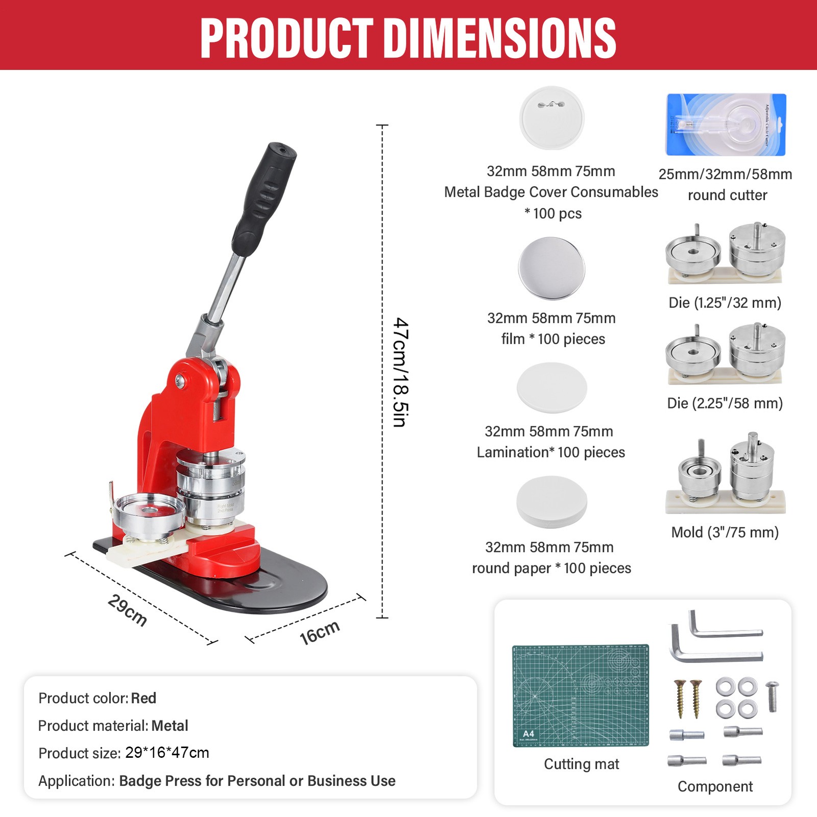 Button Maker Machine 1.25/2.28/3in DIY Pin Badge Punch Press 100Set Parts