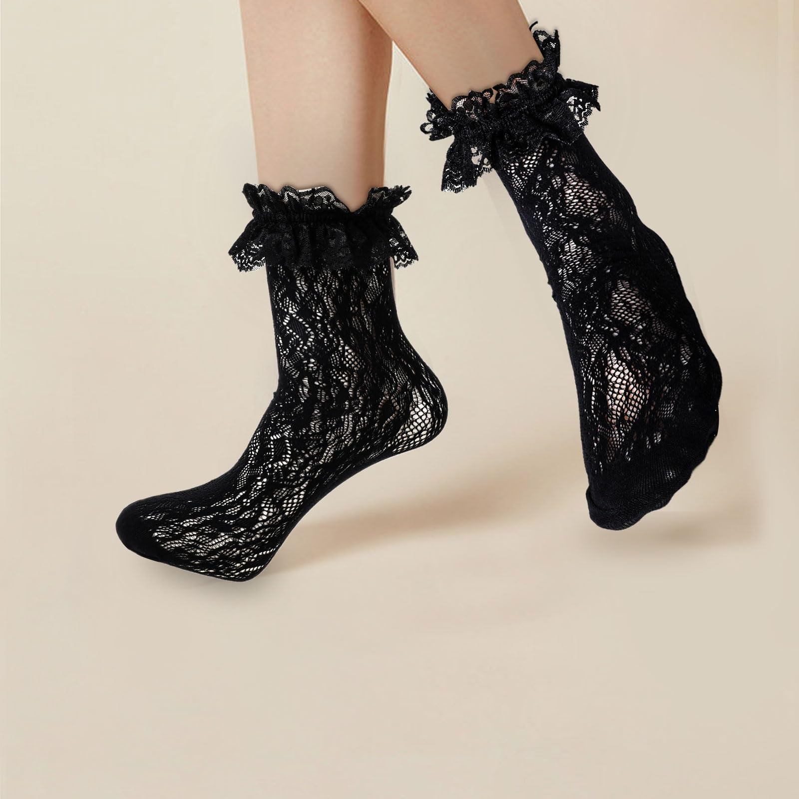 как выглядит 4 Pairs lace ruffle socks Lace Socks for Women Ankle Ruffle,White Black Mesh ... фото