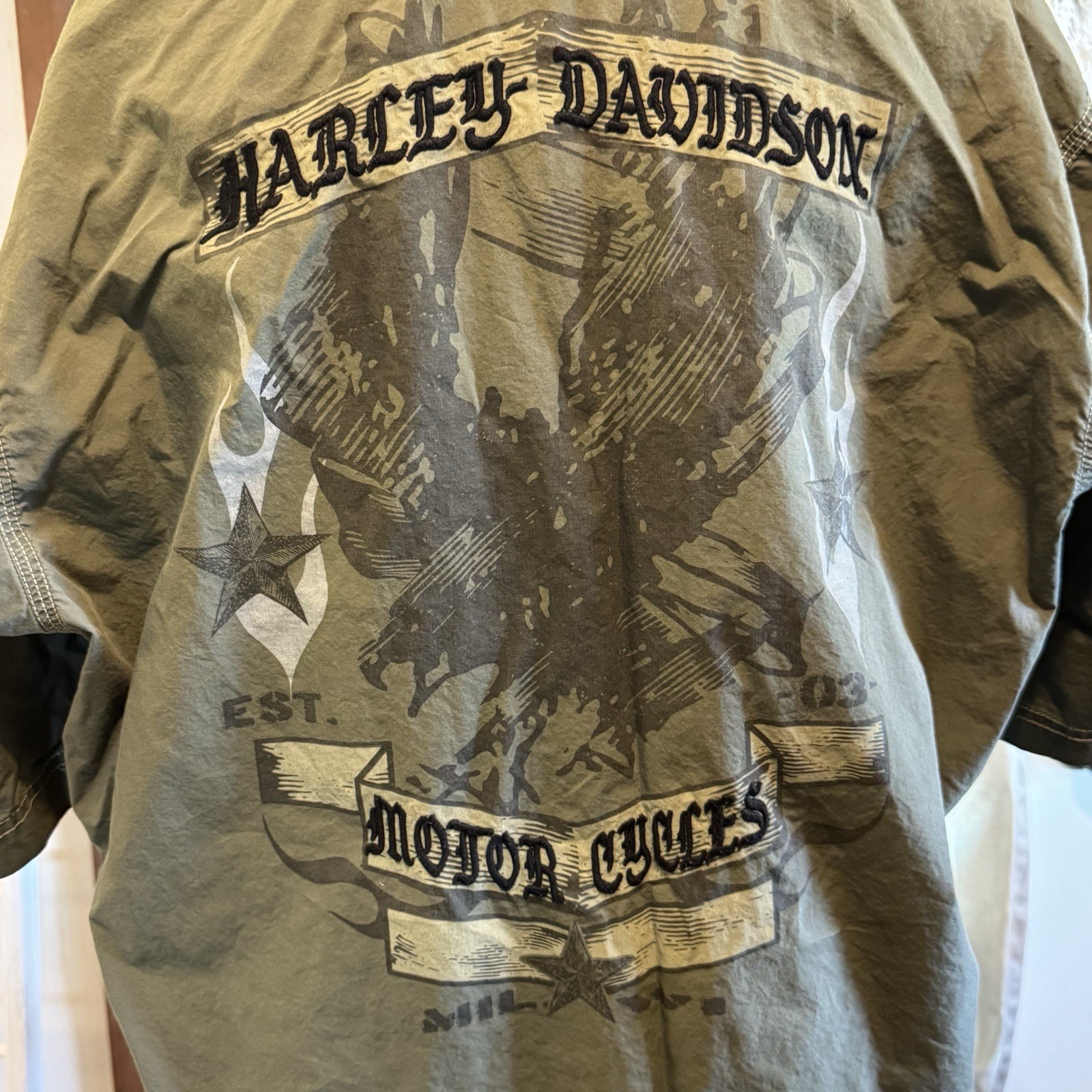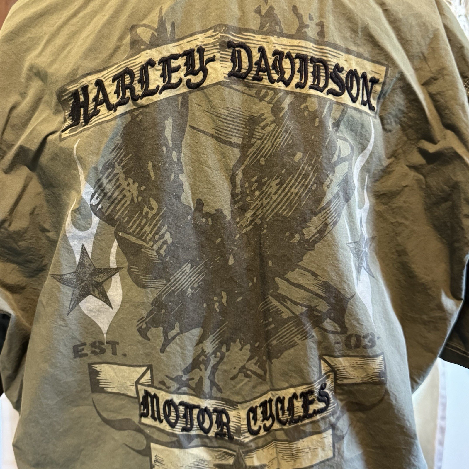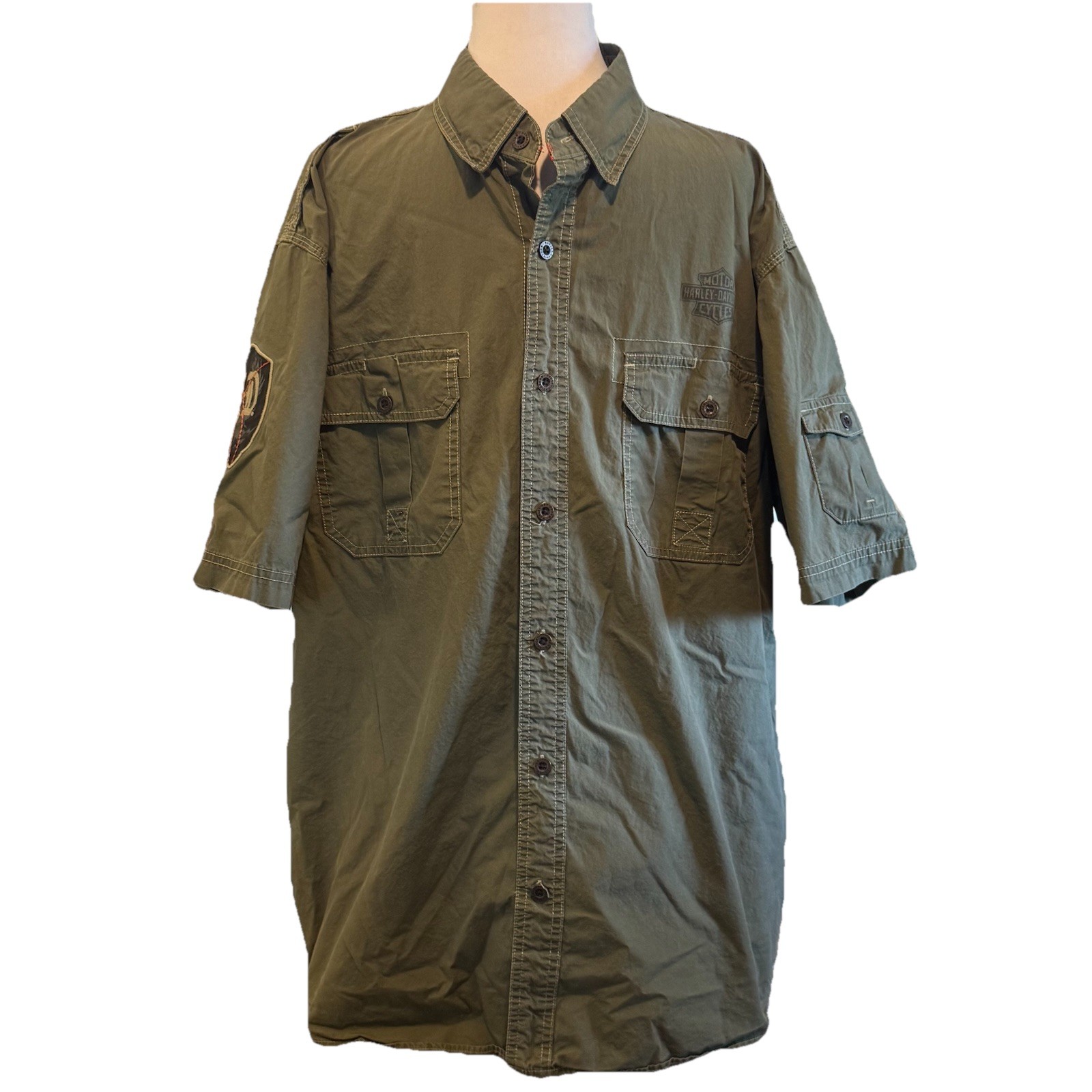 VTG Harley Davidson Green Button Pocket Short Sleeve Collar Shirt Men s 2XL