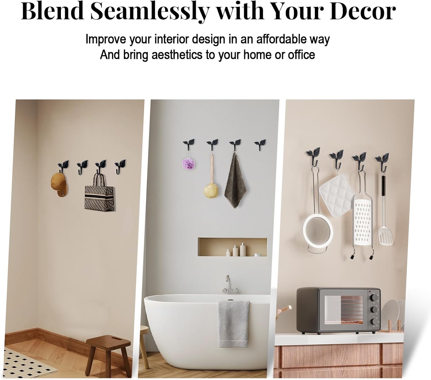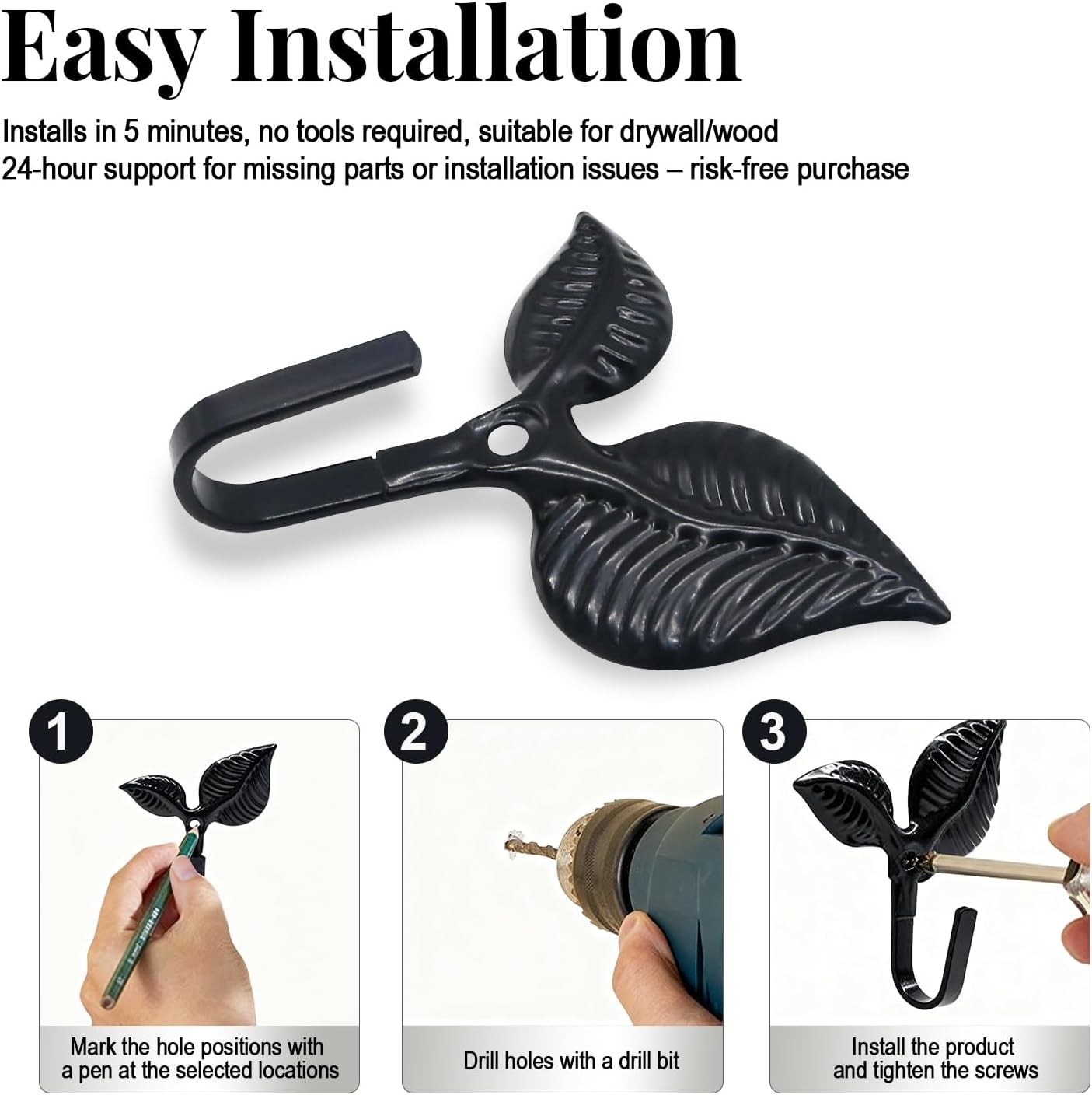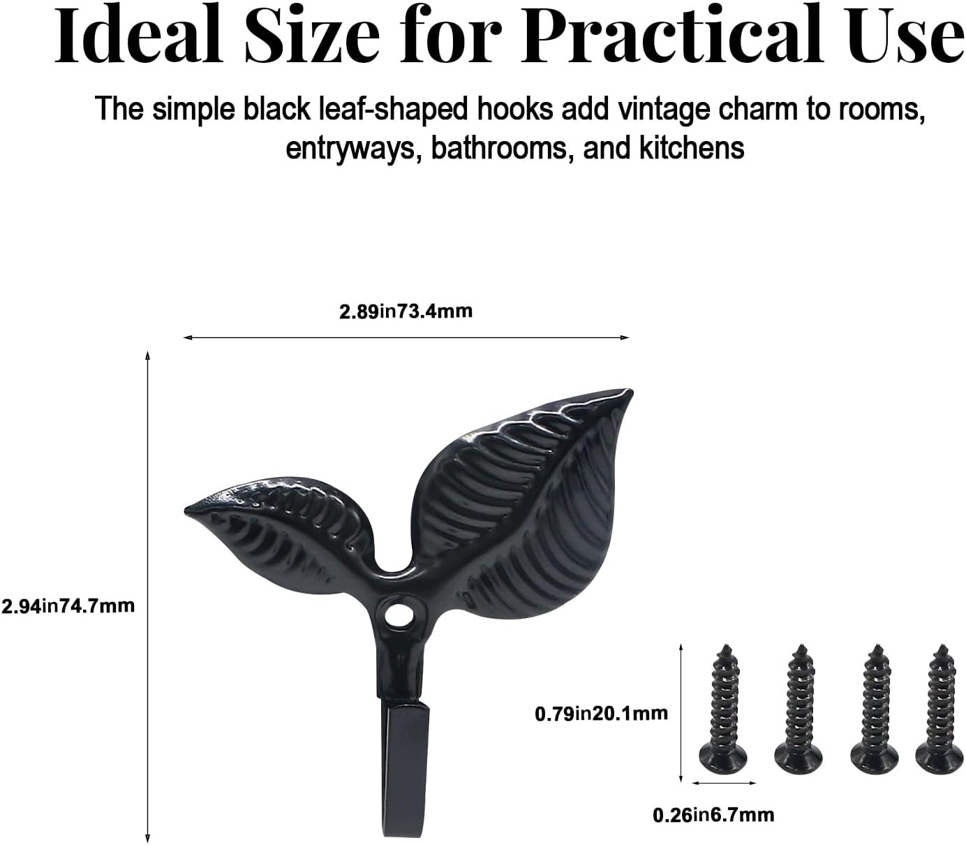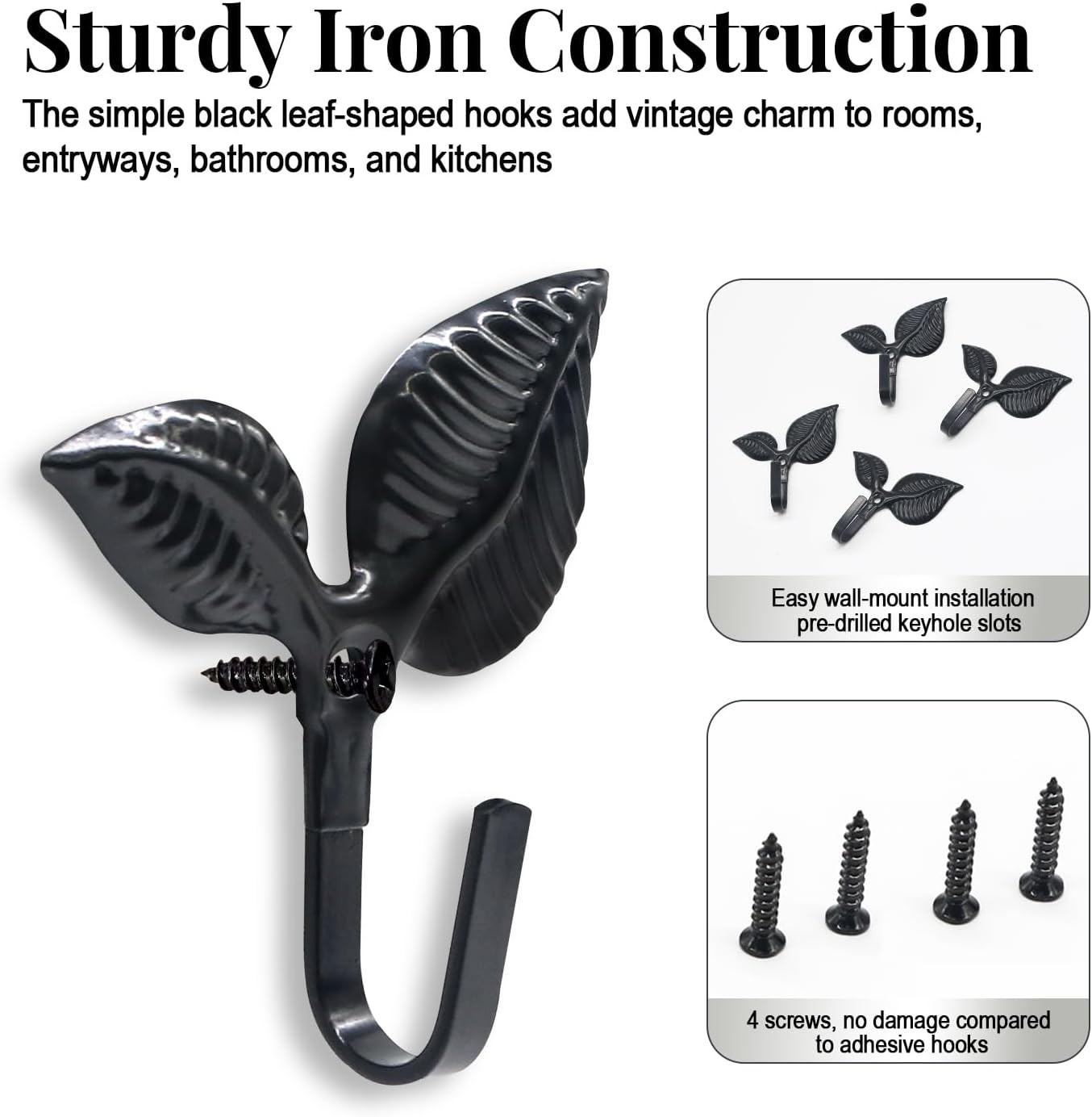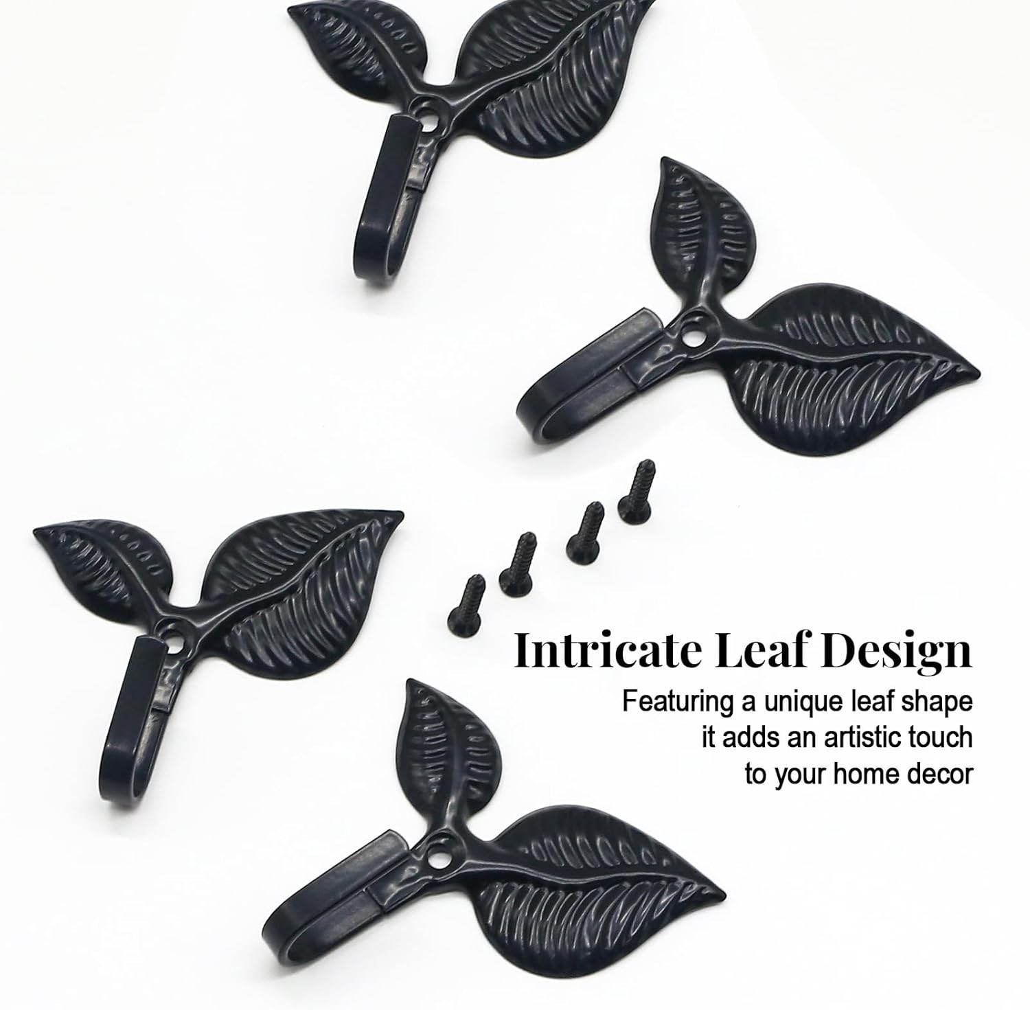 4pcs Iron Leaf Wall Hooks - Black Rustic Single Hook for Hanging Coat, Key, Bag,