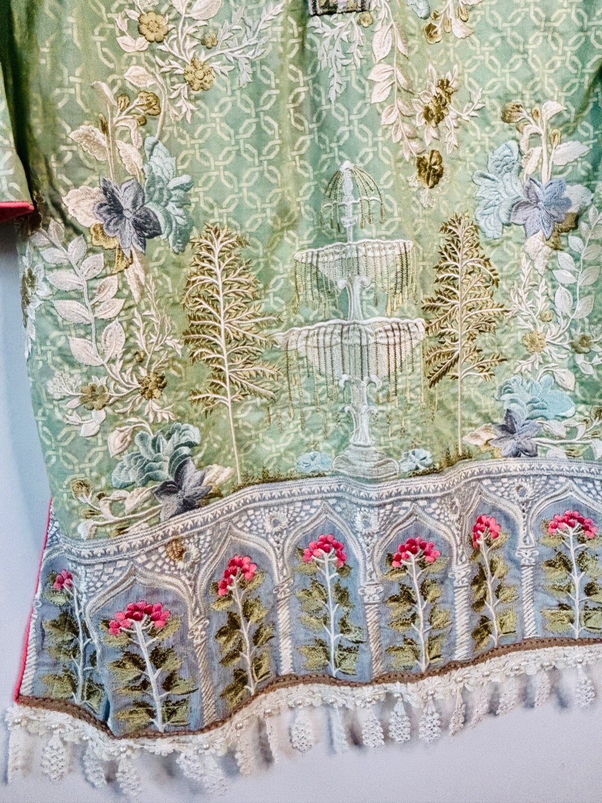 как выглядит LOVELY GREEN PINK EMBROIDERED BEADED FLORAL KURTI SHALWAR KAMEEZ TOP PANTS SET L фото