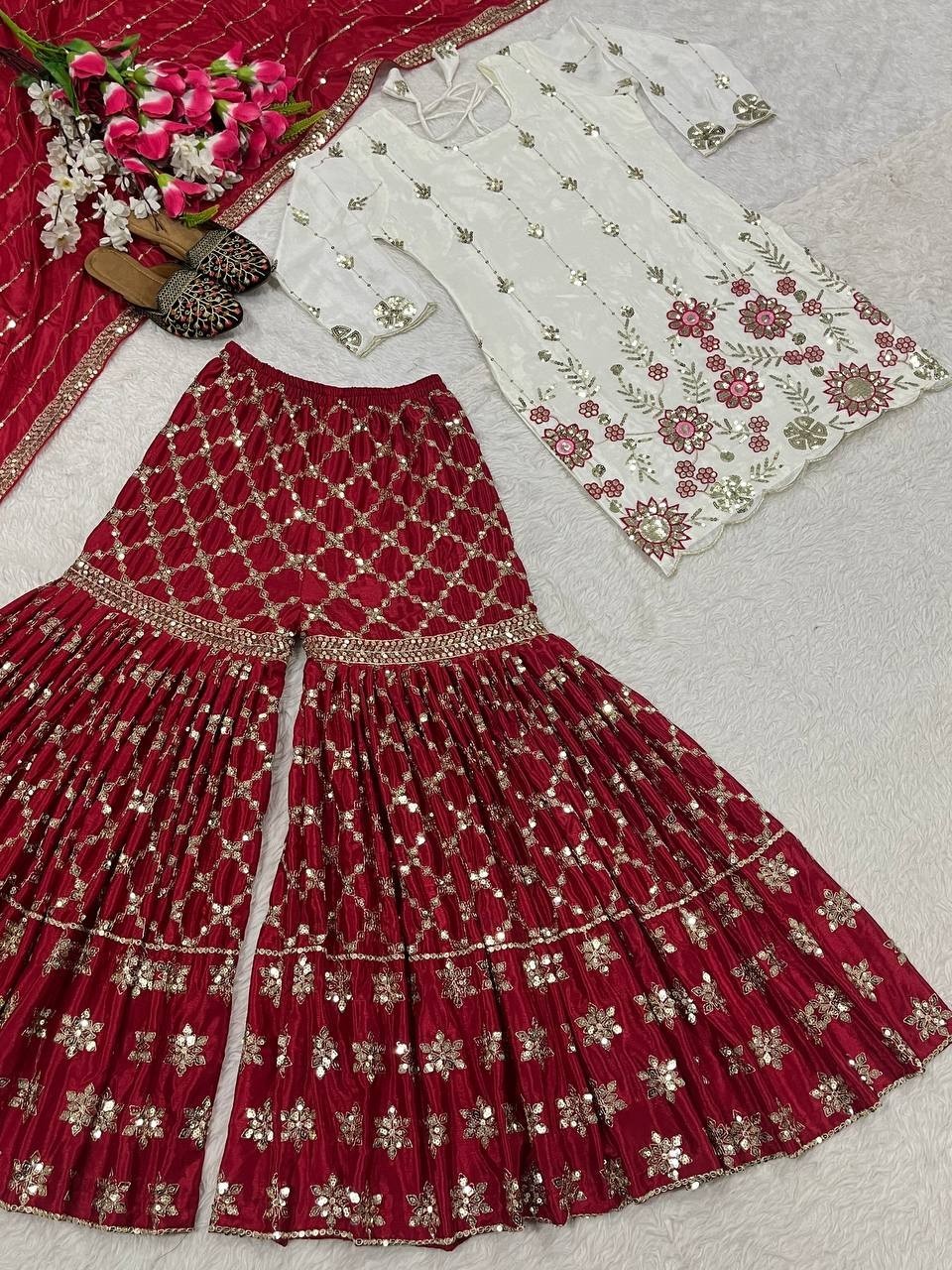 Stylish Look Chinon Silk White Top Palazzo With Dupatta For Function Wear