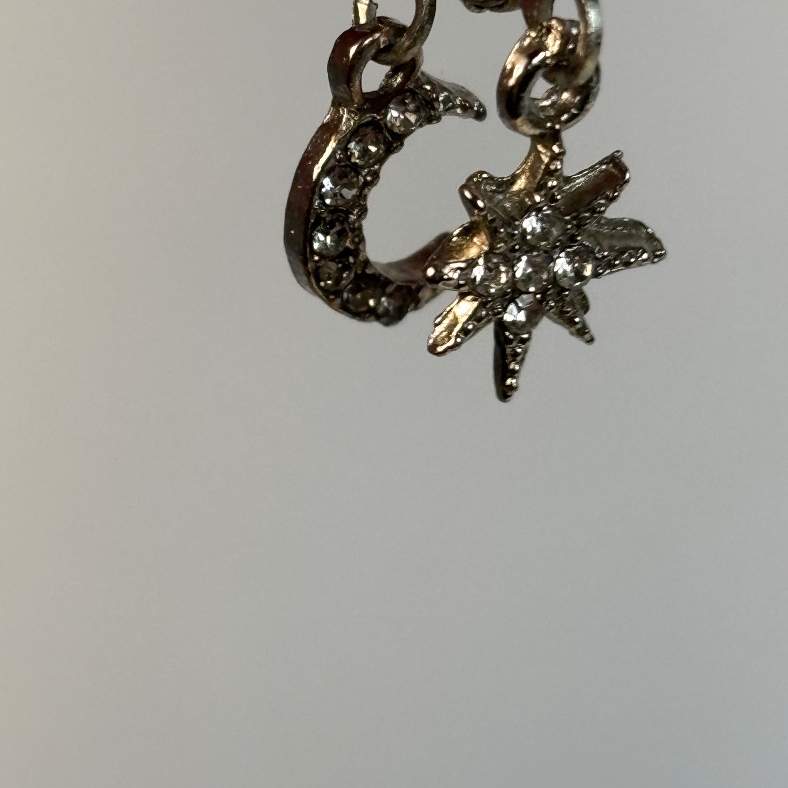 Celestial Hoop Earrings Silver Star and Crescent Moon Mismatched Rhinestone