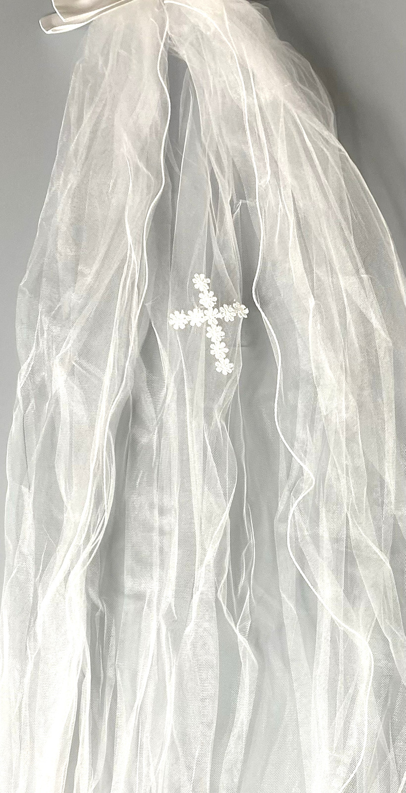 First Communion Veil Headwear White Satin White Bow Embroidered Cross 40 inches