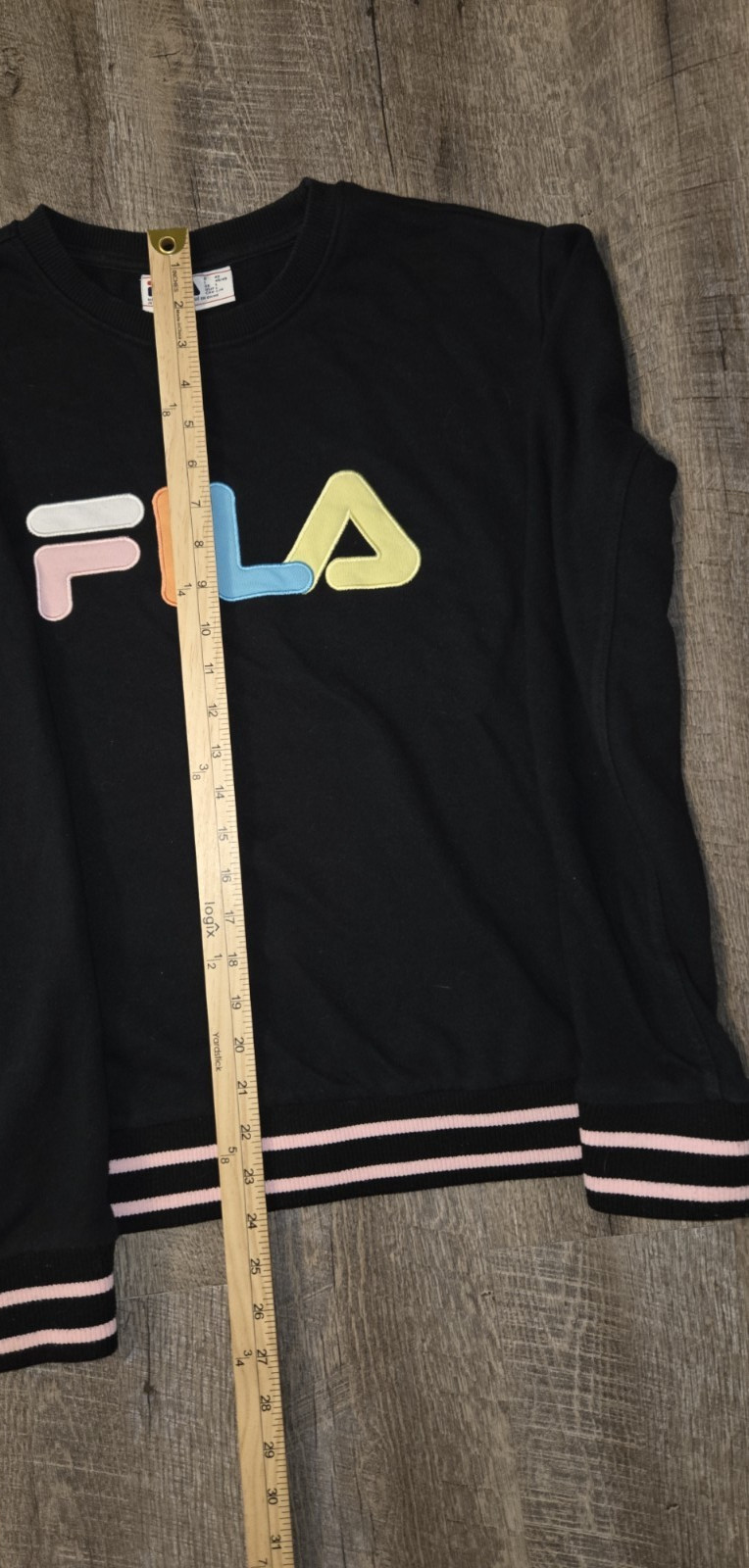 как выглядит Fila Size L Black Sweatshirt Colorful Spell out Logo Pink Stripe Hem фото