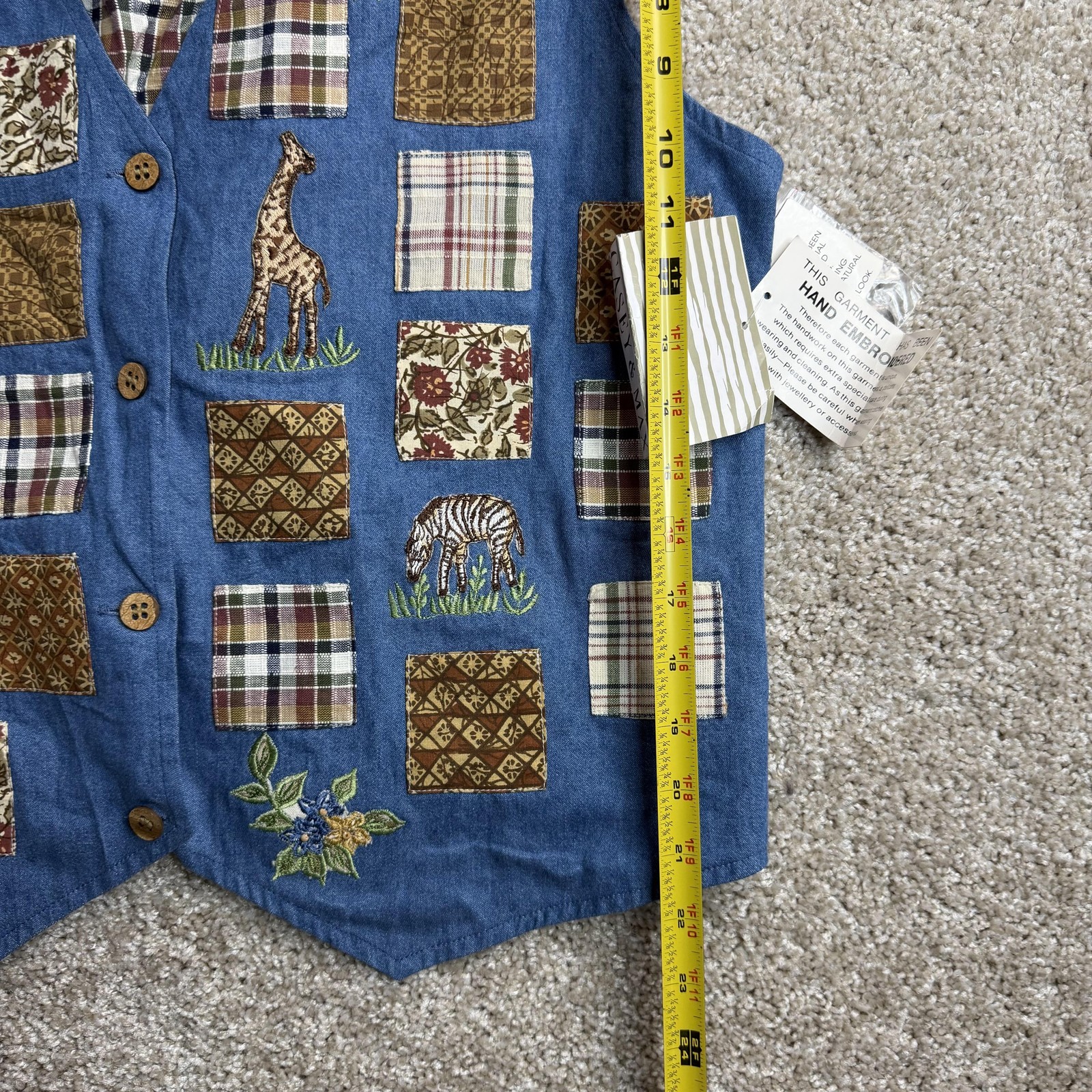 как выглядит Vintage Casey Max Vest Women XL Blue Denim Patchwork Safari Animal Embroidered фото