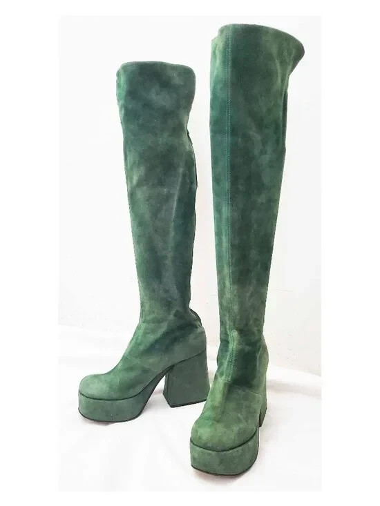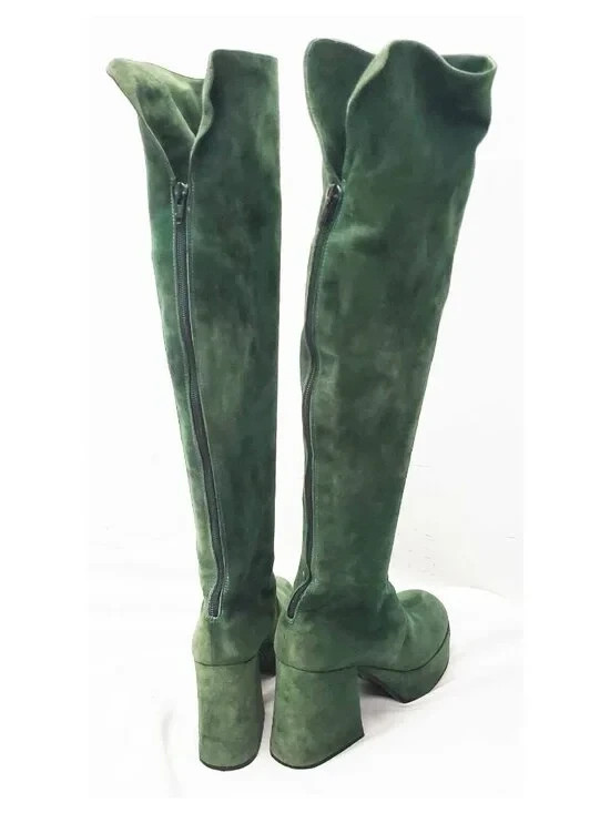 True Vintage 1970's Huge Green Suede KNEEE Platforms Shoes. OPTI Zipper. 8