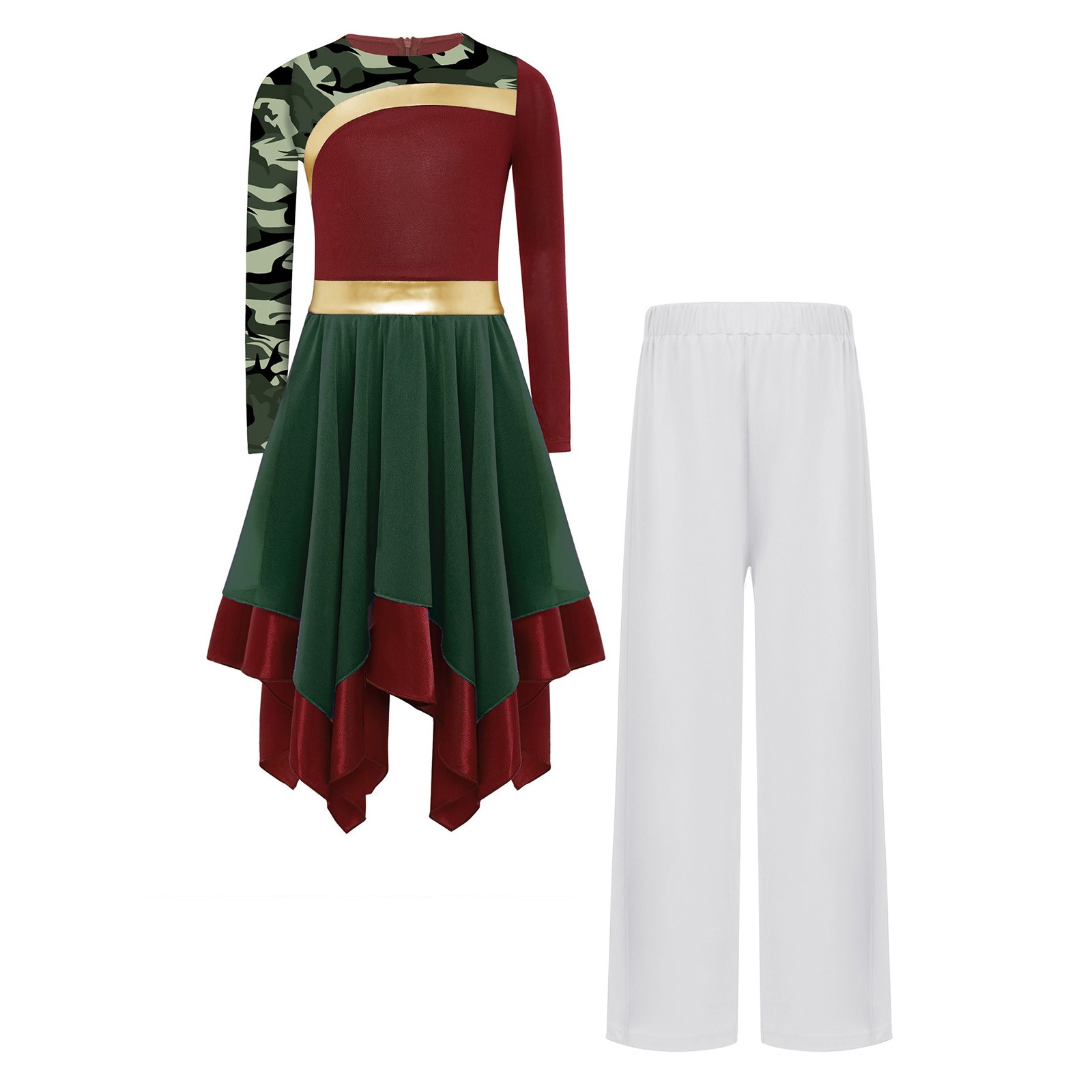 US Kids Praise Dance Dress Printed Liturgical Robe Gown with Wide Leg Pants Set