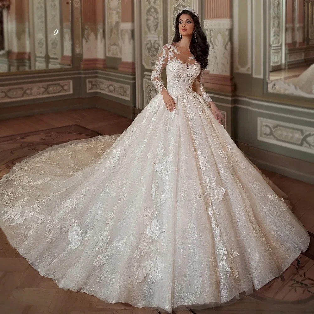 Customized Gorgeous Ball Gown Wedding Dress Long Sleeve Lace Applique Princess