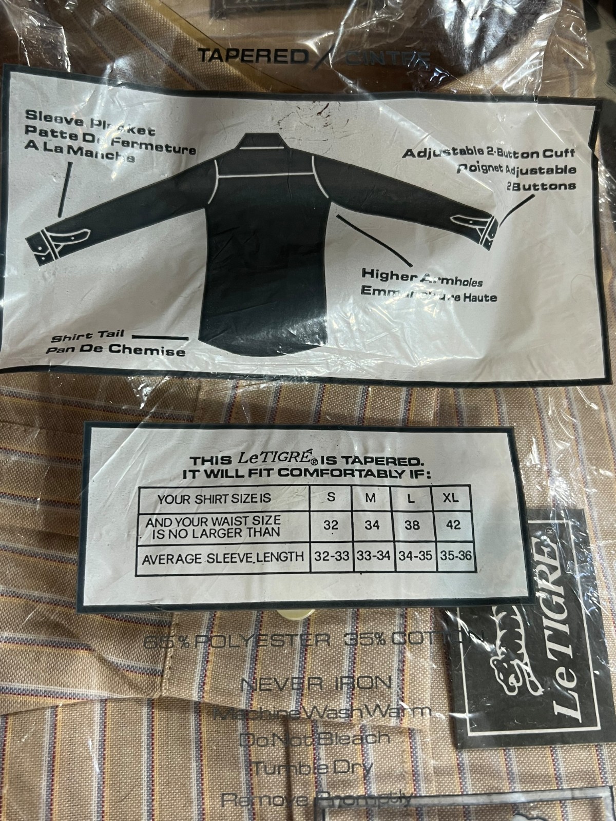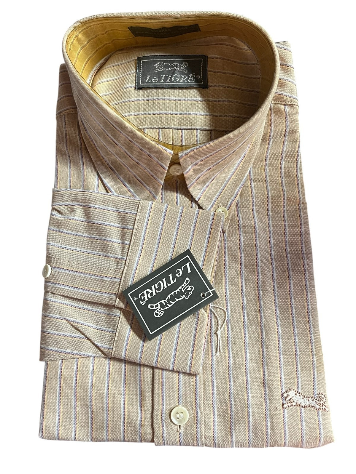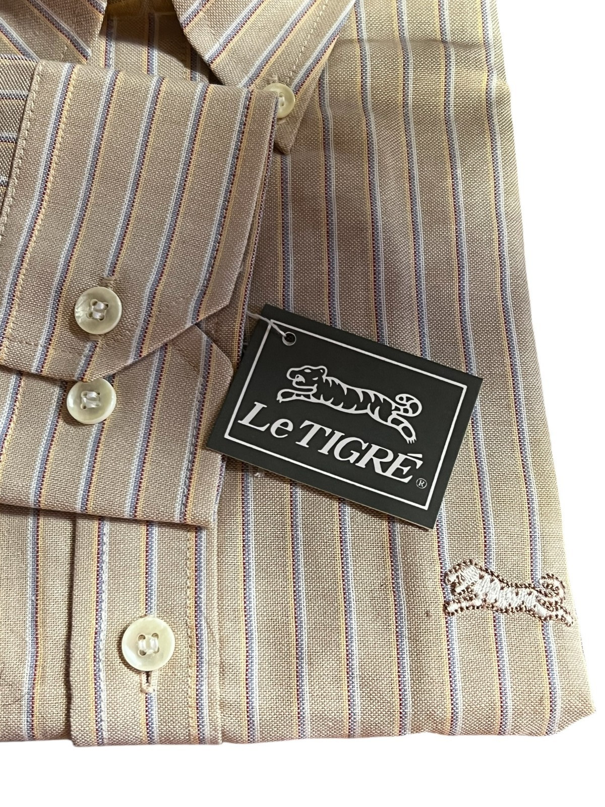 NOS Mens M Vtg 70s Shirt Le Tigre Button Down Tapered Oxford Cloth Brown Stripe