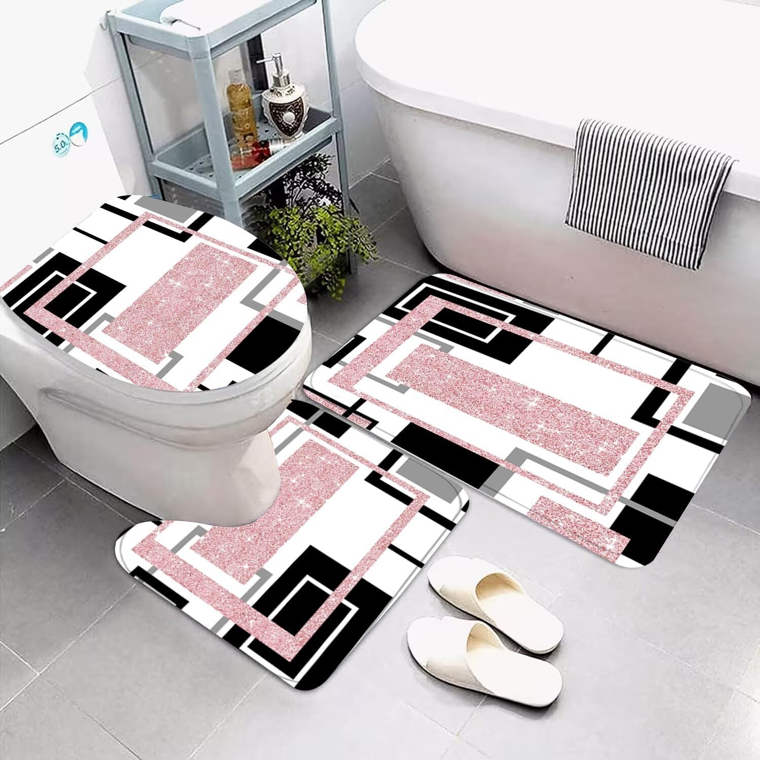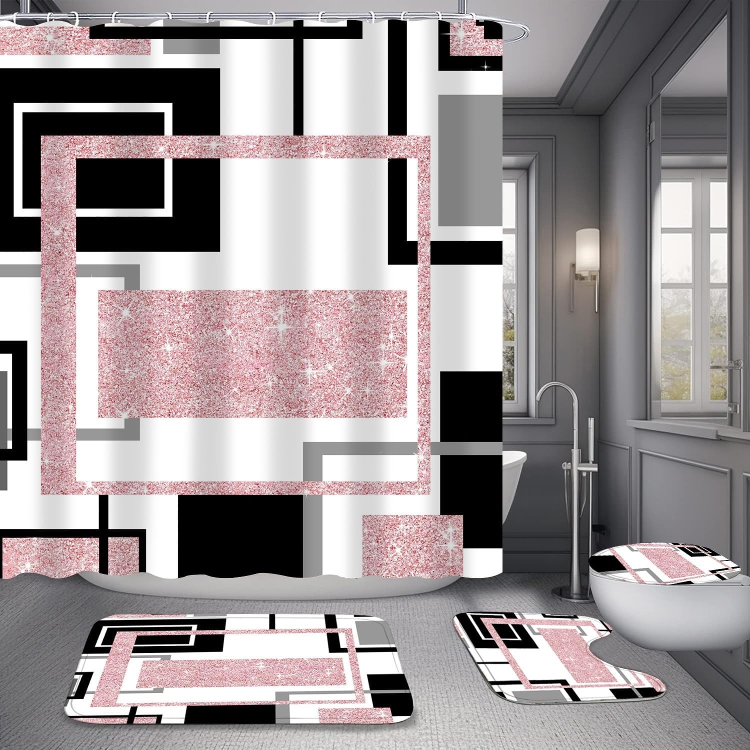 4 Pcs Pink Geometric Shower Curtain Sets Non-Slip Bath Rugs, Toilet Cover, U-...