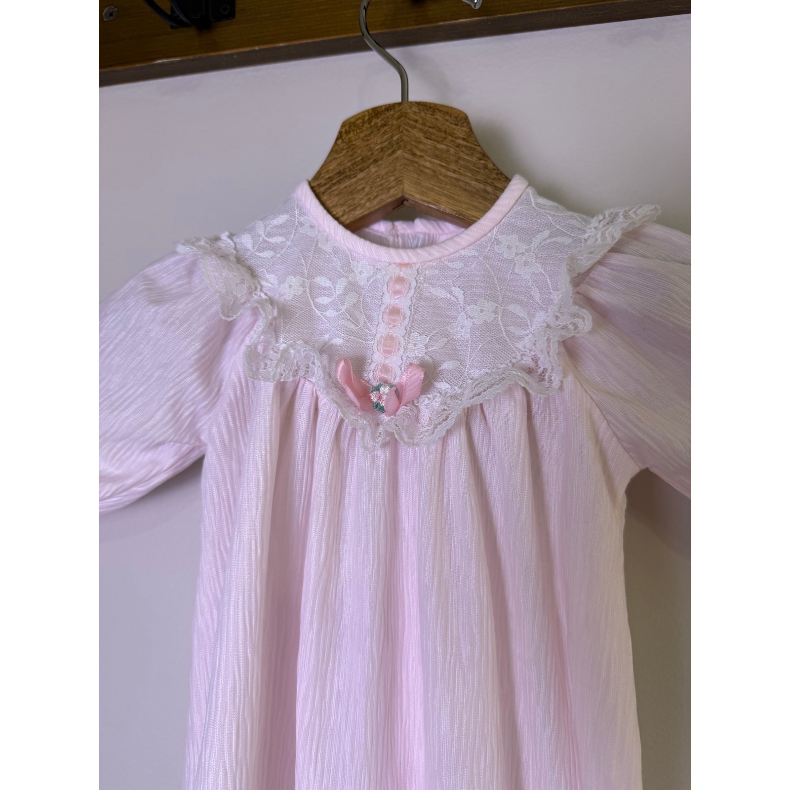 как выглядит Vintage Baby Pink Lace Yoke Nightgown Long Sleeve Ruffle Hem Infant Gown 18mo фото