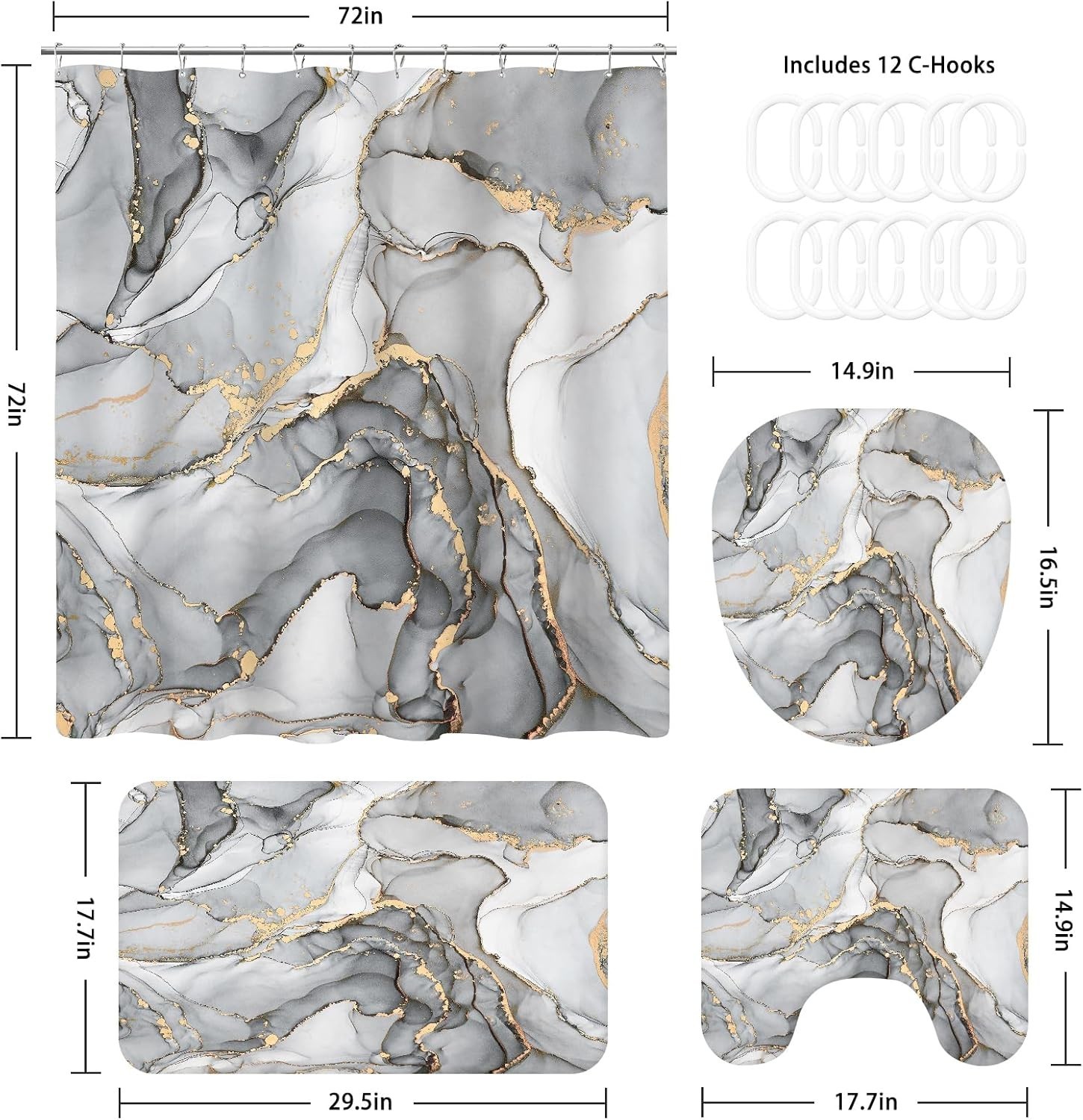 4PCS Grey Marble Bathroom Sets with Shower Curtain and Rugs, Abstract Shower ...