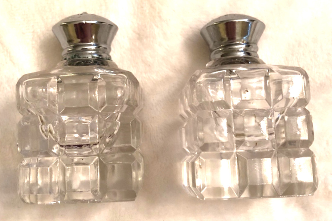 • Vtg Cut Glass Clear Square Salt Pepper Shakers Grid/Cube Pattern MCM Japan