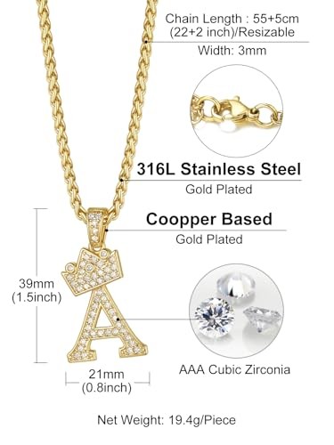 Initial Necklace for Men A-Z 18K Gold Plated Crown Shiny Cubic Initial A