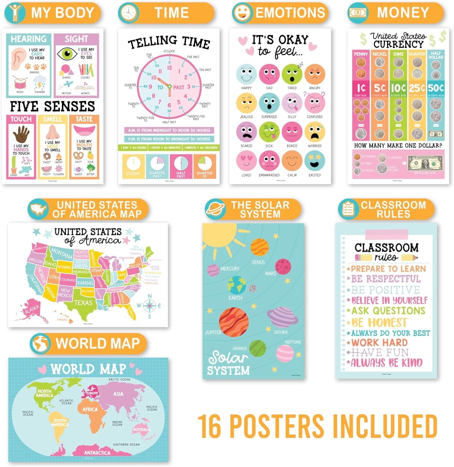 16 Colorful Educational Posters for Preschool - Laminated Classroom Must-Haves