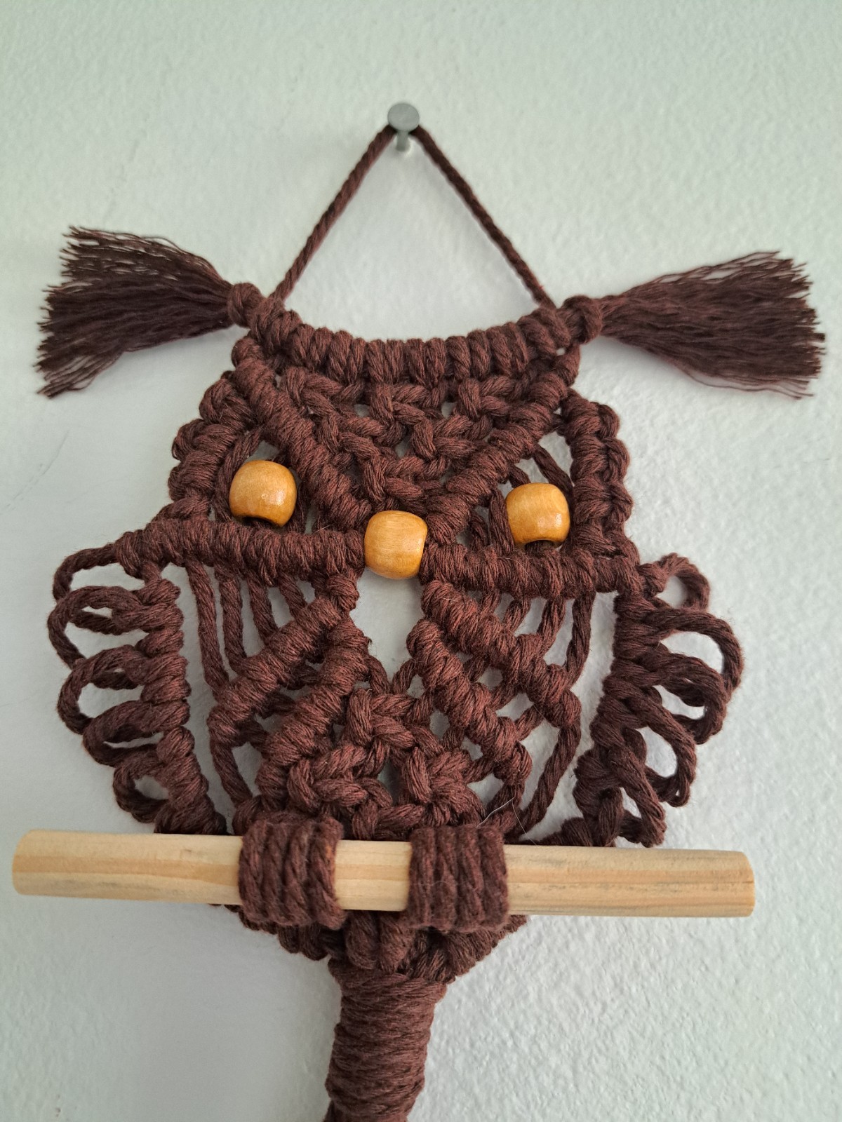 Macrame Owl Wall Hanging, Handmade, 12 x 6, Brown, Wood Beads