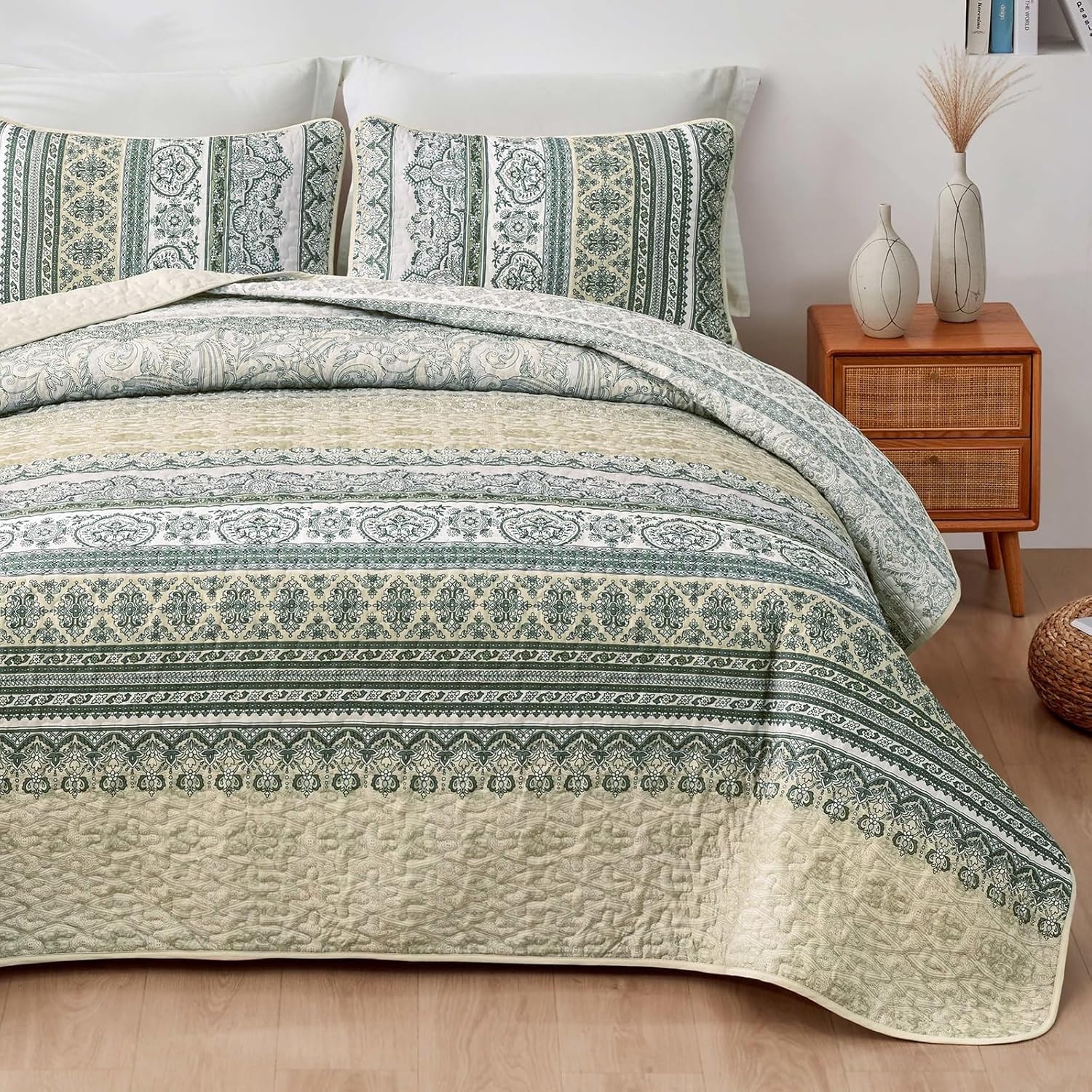 Boho Quilt Set Queen Size Beige 3 Pieces Striped Bedspread Coverlet Set, Bohe...