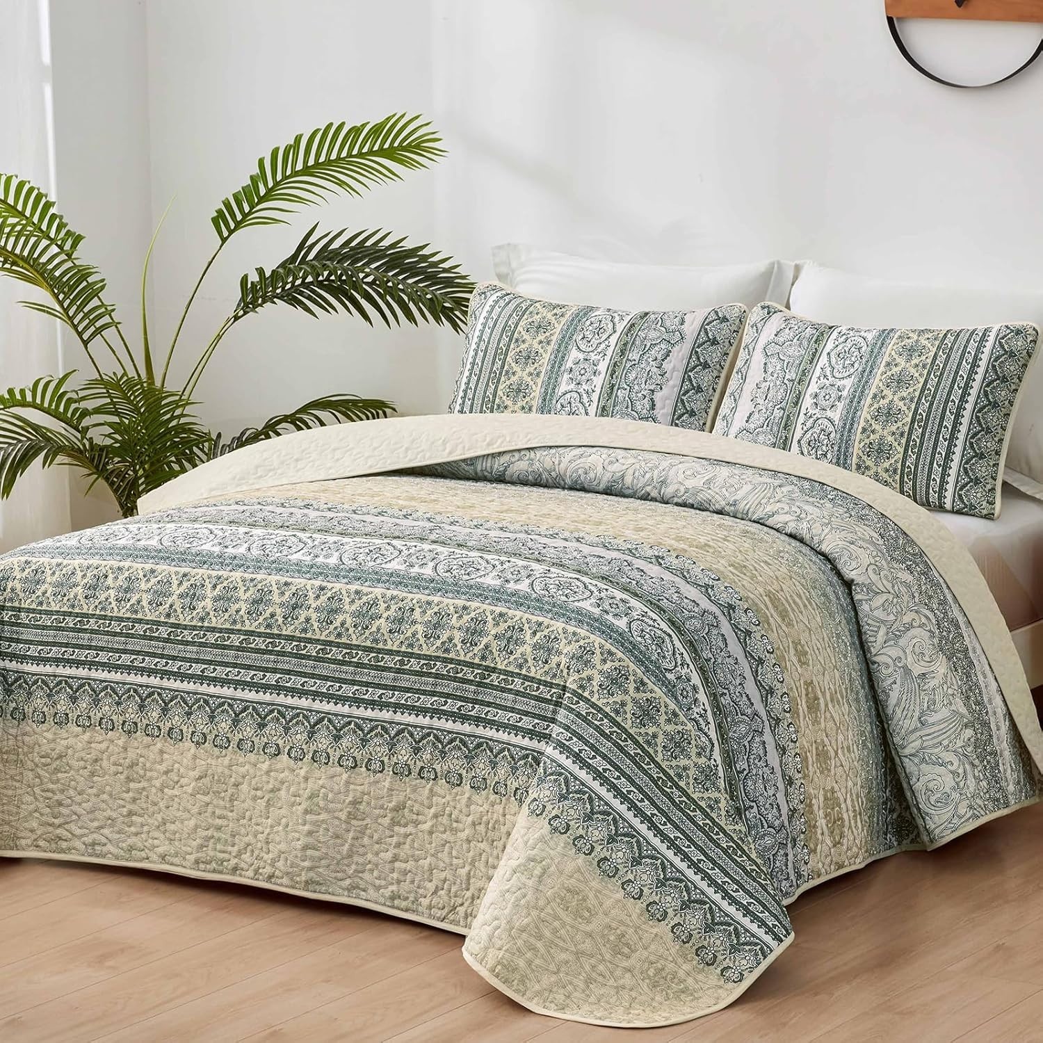 как выглядит Boho Quilt Set Queen Size Beige 3 Pieces Striped Bedspread Coverlet Set, Bohe... фото