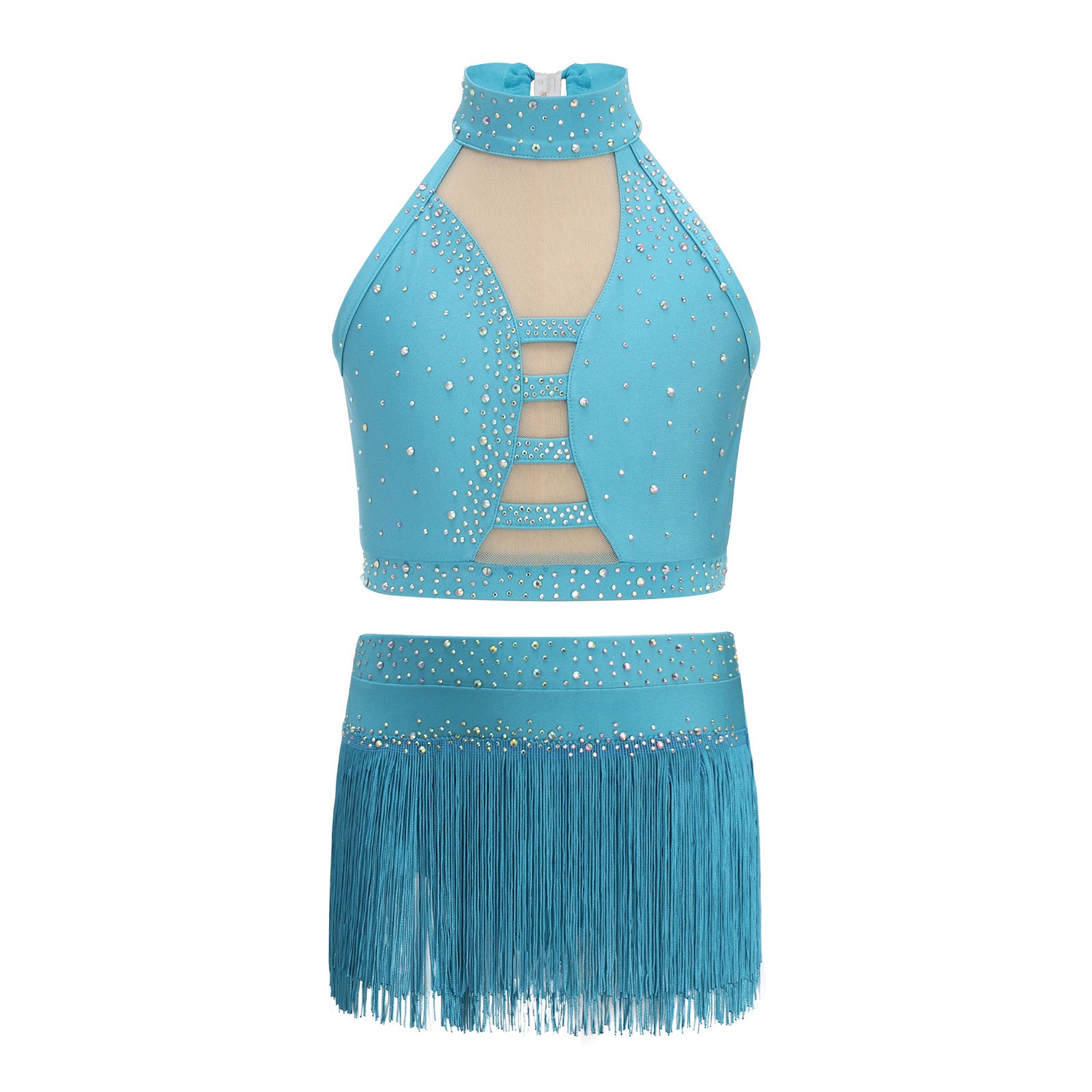 как выглядит Girls Latin Dance Rumba Dance Outfits Performance Fringe Skirt Bold Rhinestone фото