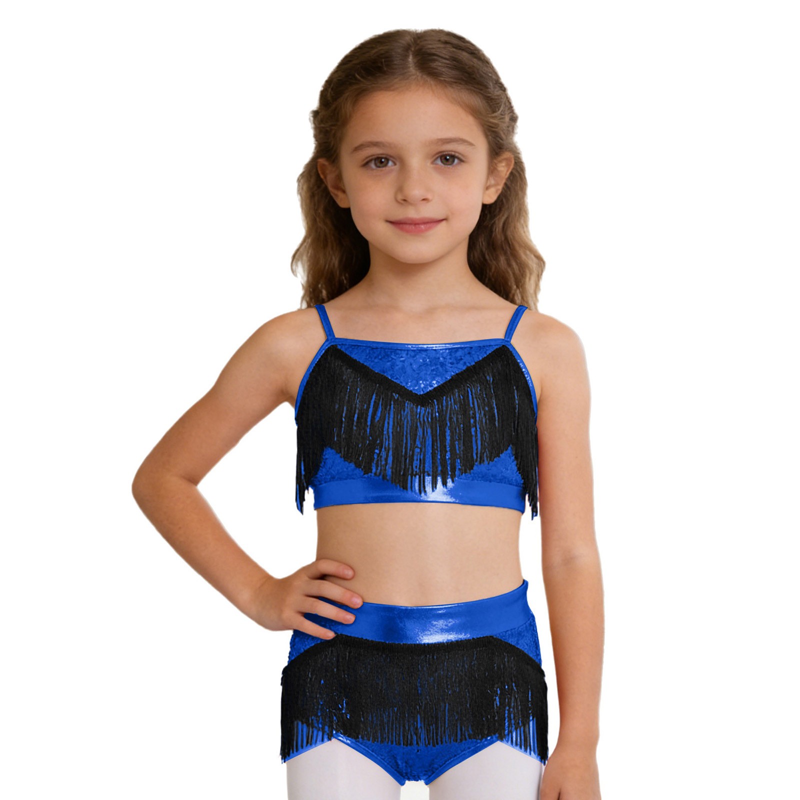 как выглядит Kids Girls Competition Tassel Outfit Back Dancewear Ruched Team Samba Latin фото