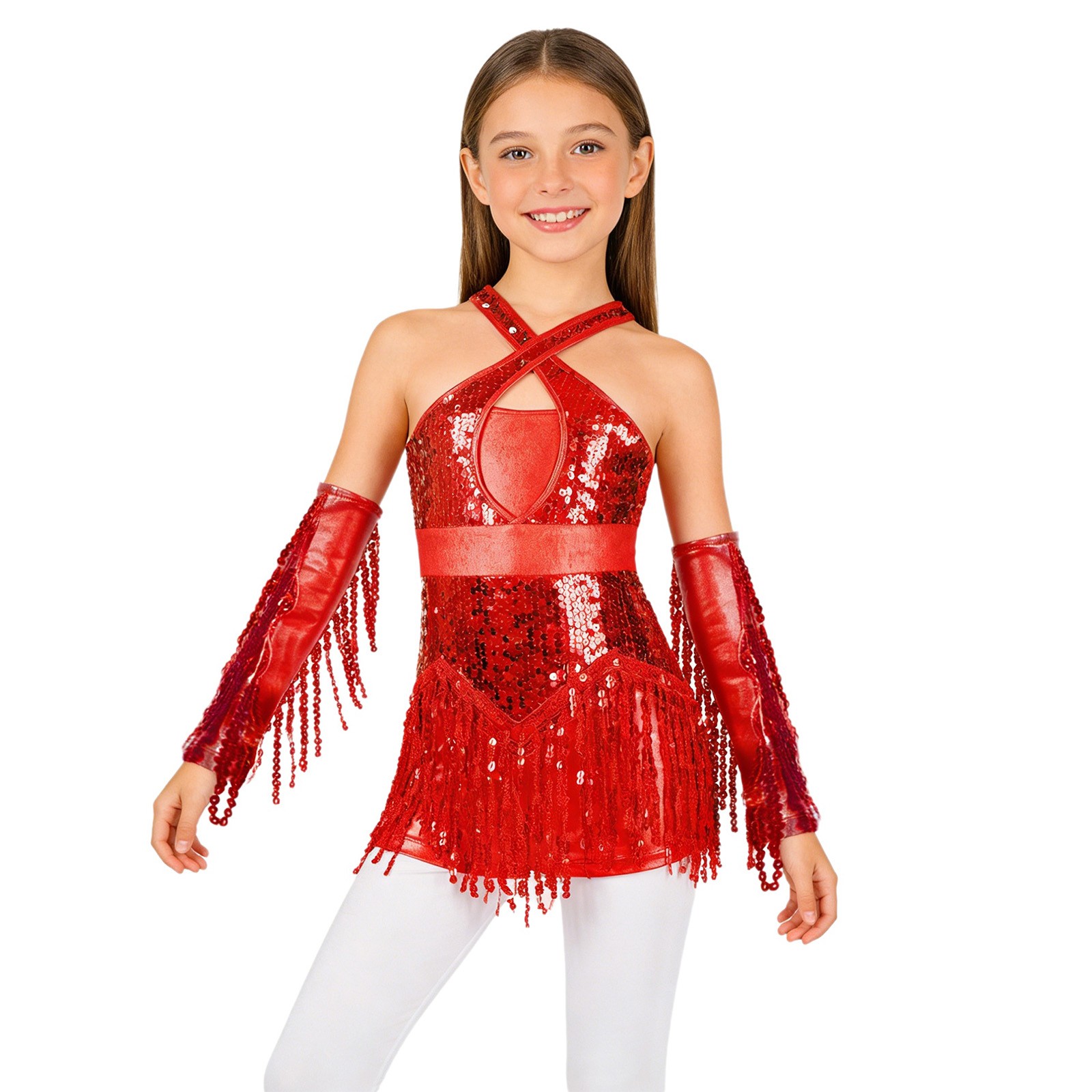 US Kids Sequin Fringe Latin Dance Costume Dance Tassel Leotard Dress with Gloves