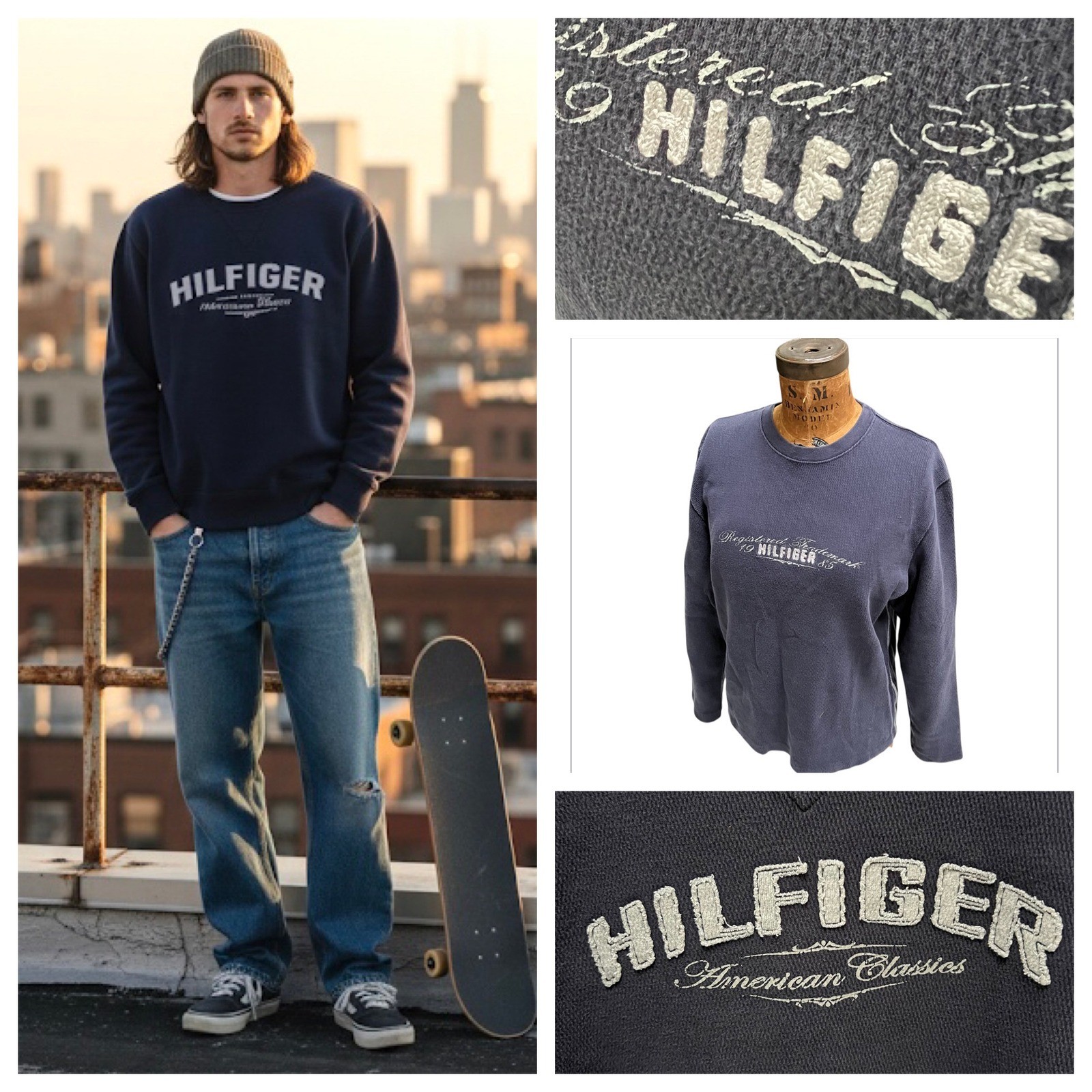 Vintage Tommy Hilfiger Navy Spellout Logo Sweatshirt Men Y2K Skater Grunge M