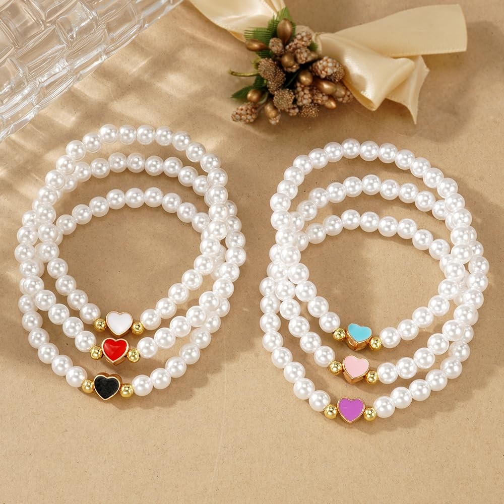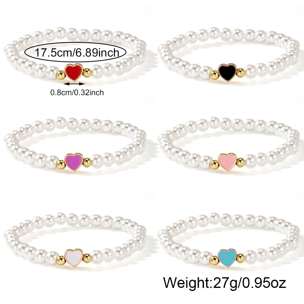 6PCS/set Pearl Colorful Love Heart Drawstring Bracelet for Women,Dainty gold Bea